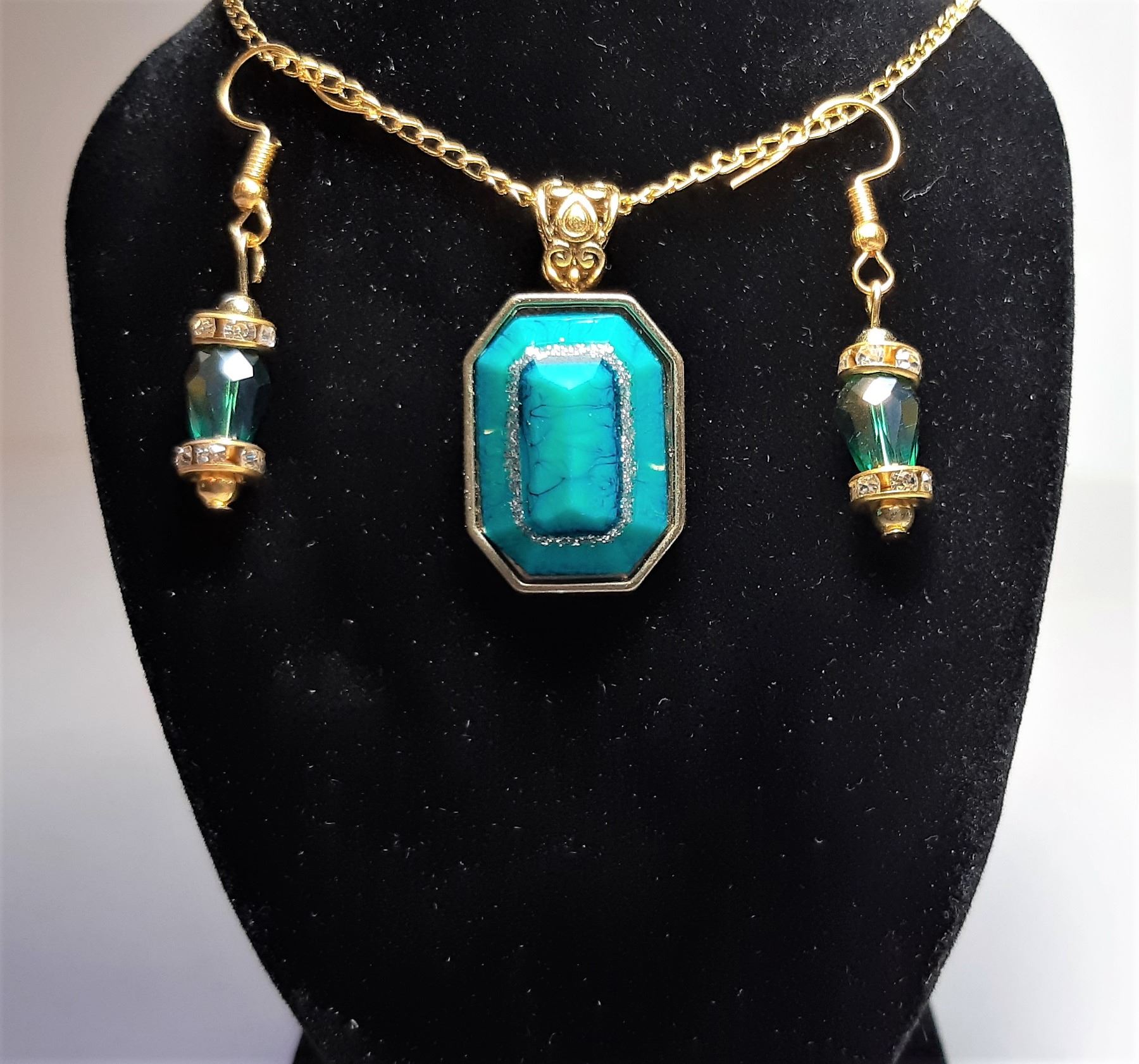 TURQUOISE AND SPARKLE DETAIL PENDANT ON CHAIN AND COORDINATING SWAROVSKI CRYSTAL DROP EARRINGS WITH CLEAR CRYSTAL RONDELLES ON FISHHOOKS. JEWELLERY