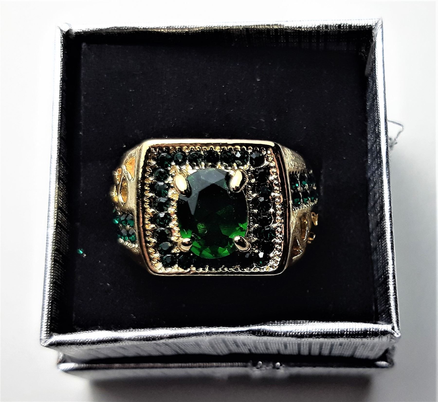 RING WITH STONES SURROUNDING THE CENTRE STONE AND STONES & CARVING ON THE SHOULDERS, SIZE 6.5. JEWELLERY