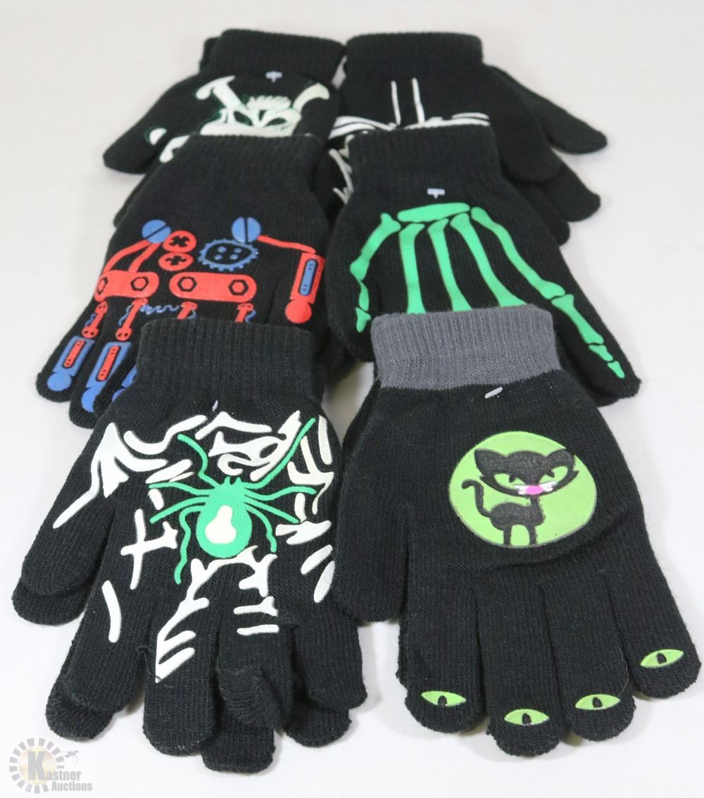 6 PACK YOUTH GLOW IN THE DARK HALLOWEEN GLOVES