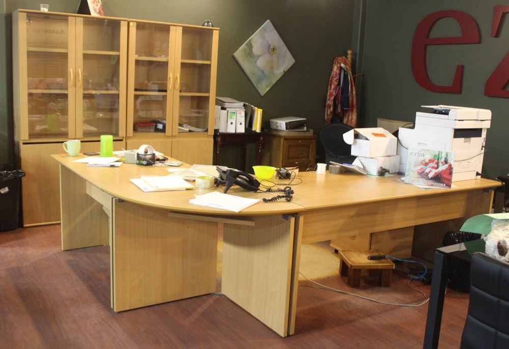 CAN'T BE PICKED UP UNTIL FRIDAY NOVEMBER 23 AFTER 1:00PM INCLUDES: 3 PIECE DESK, DRAWER CABINET AND 2 QURIO FLOOR DISPLAY, AS IS