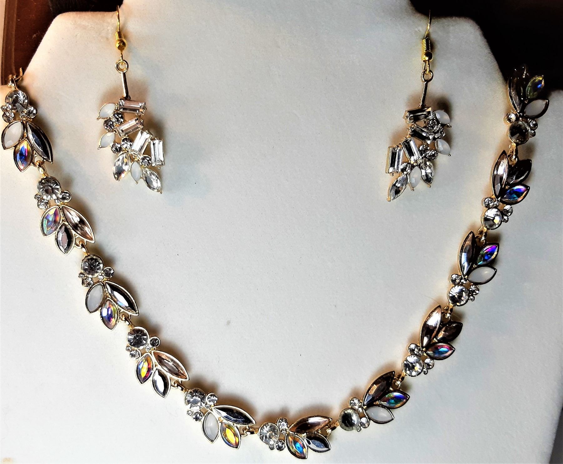 RAINBOW CRYSTAL LEAF DESIGN NECKLACE & EARRINGS. JEWELRY