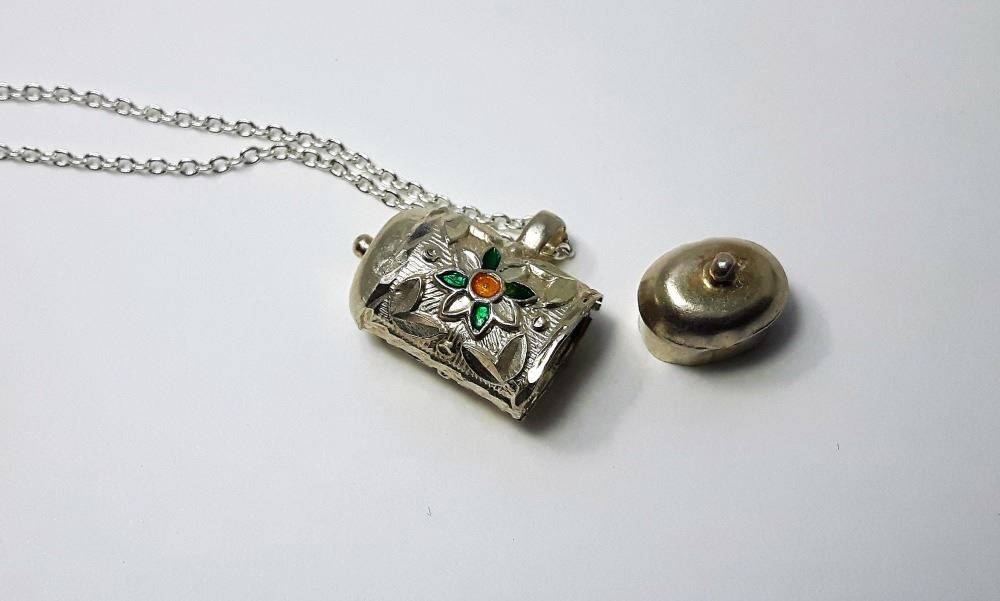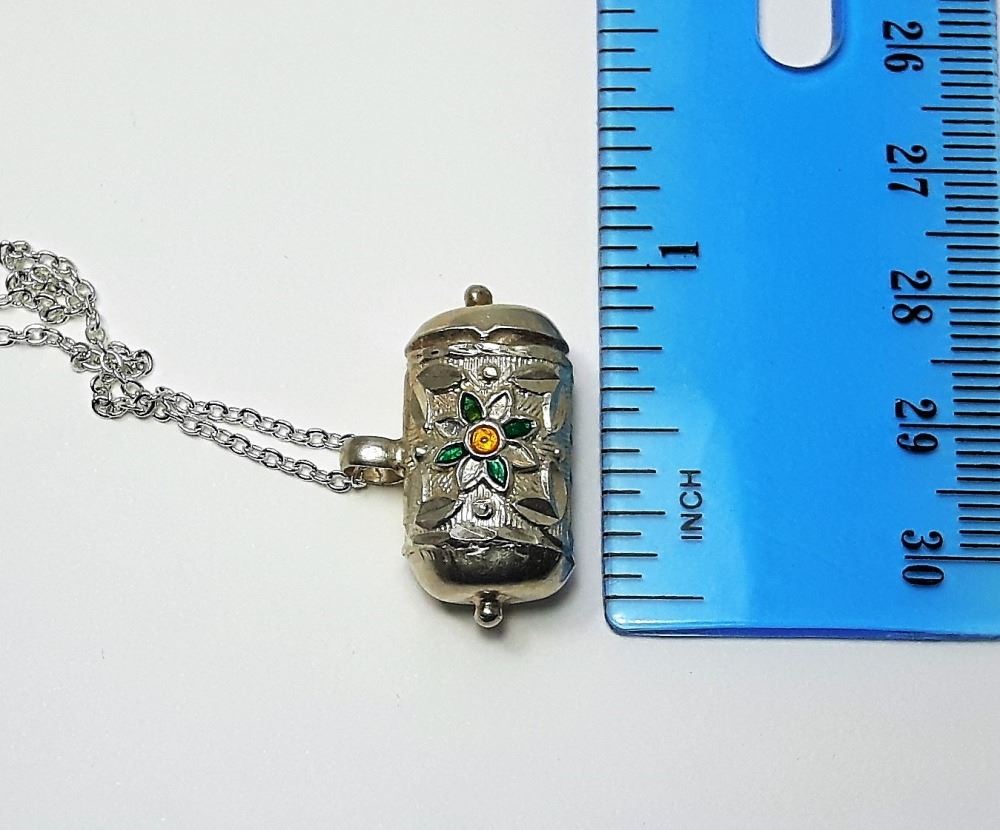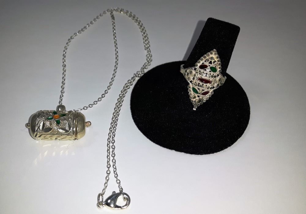 COORDINATING RING. BOTH PIECES FEATURE ENAMELED ACCENTS. RING IS SZ 6.75, PENDANT FEATURES A SECRET COMPARTMENT, 16" CHAIN. JEWELRY