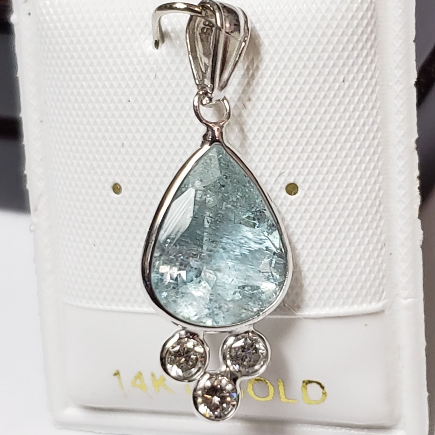 THE BRIGHT POLISHED BEZEL STYLE PENDANT SETTING SECURES, ONE PEAR SHAPED NATURAL AQUAMARINE (MEASURING 12.00 - 9.50 X 6.30 MM, TONE MEDIUM, HUE SLIGHTLY GREENISH/BLUE, CLARITY GRADE I-2 SEMI TRANSPARENT,THE AQUAMARINE WEIGHS 3.70 CARATS) THE BOTTOM OF THE SETTING SECURES THREE ROUND BRILLIANT CUT DIAMONDS (MEASURING 2.90 MM, CLARITY GRADE I-2, COLOR GRADE G-H, WEIGHING IN TOTAL 0.30 CARAT) COMES WITH CERTIFICATE OF APPRAISAL FROM LOCALAPPRAISER, SUGGESTED INSURANCE COVERAGE $960.00. JEWELLERY