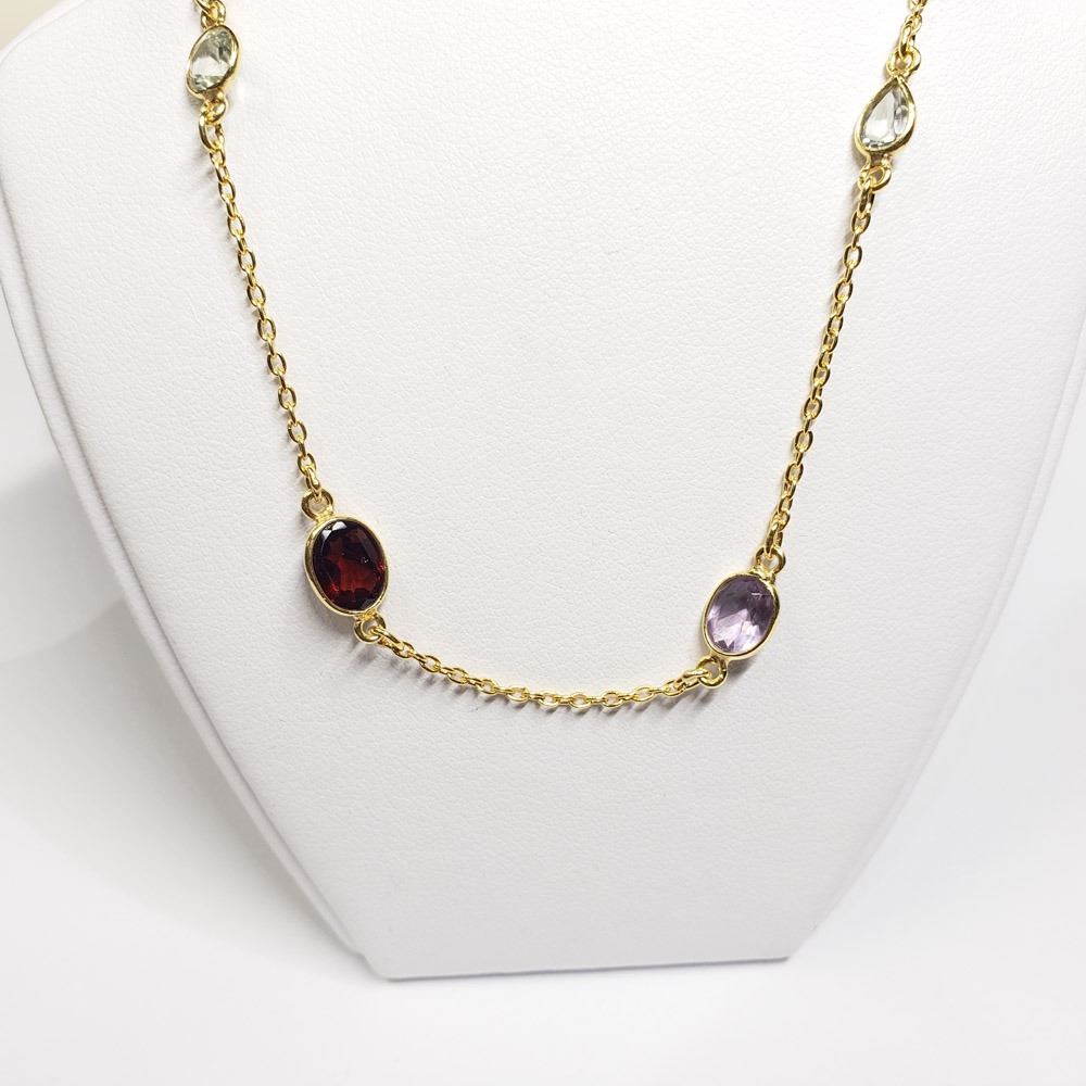 160 - JT36 - GOLD-PLATED STERLING SILVER GARNET BLUE TOPAZ AMETHYST NECKLACE (~LENGTH 23CM) (~WEIGHT 6G). JEWELRY