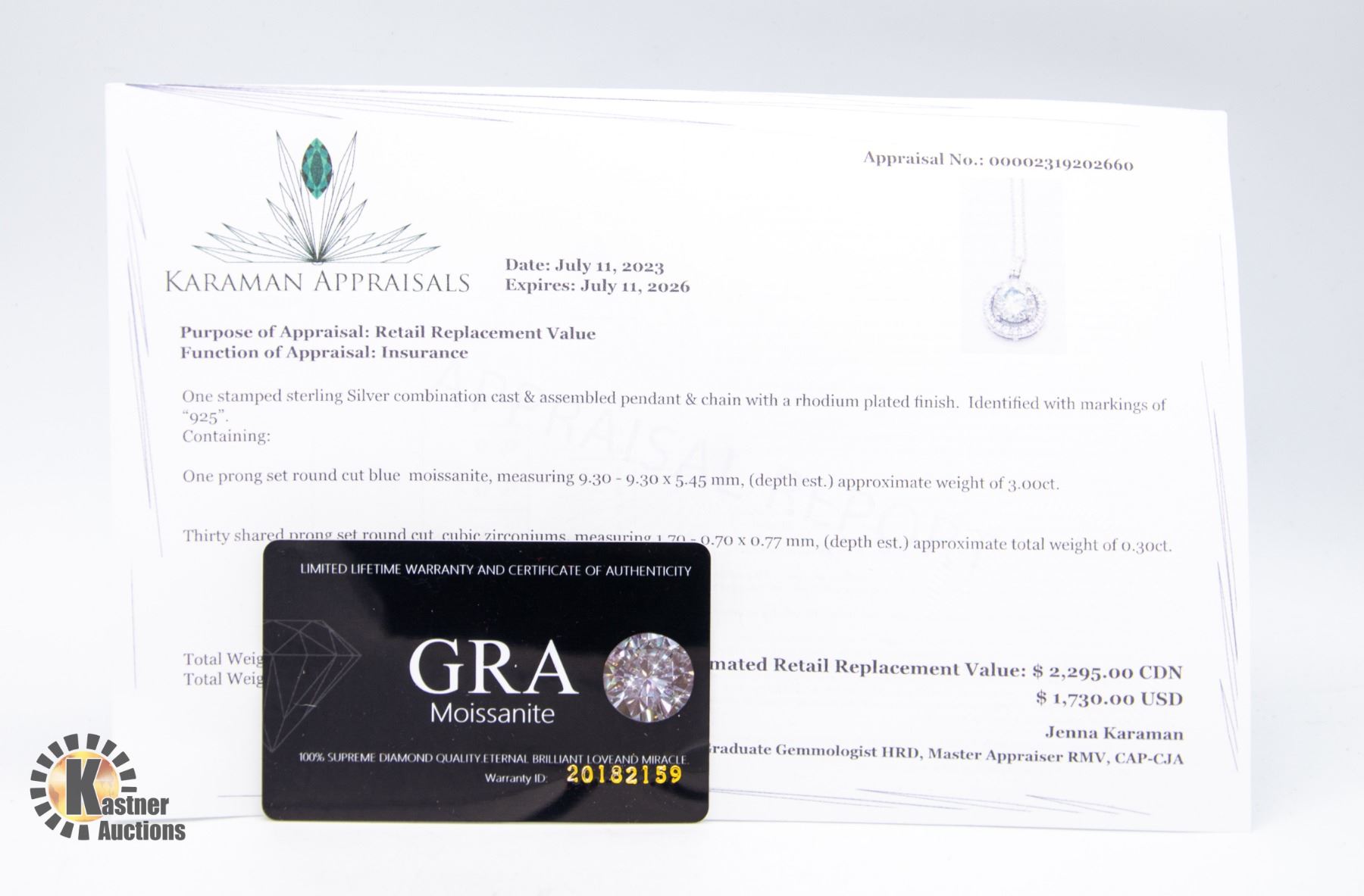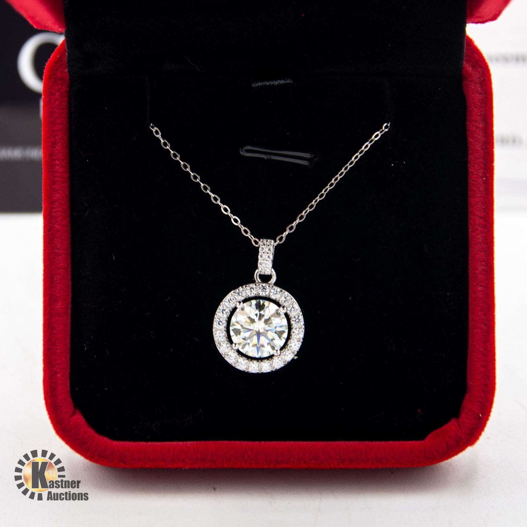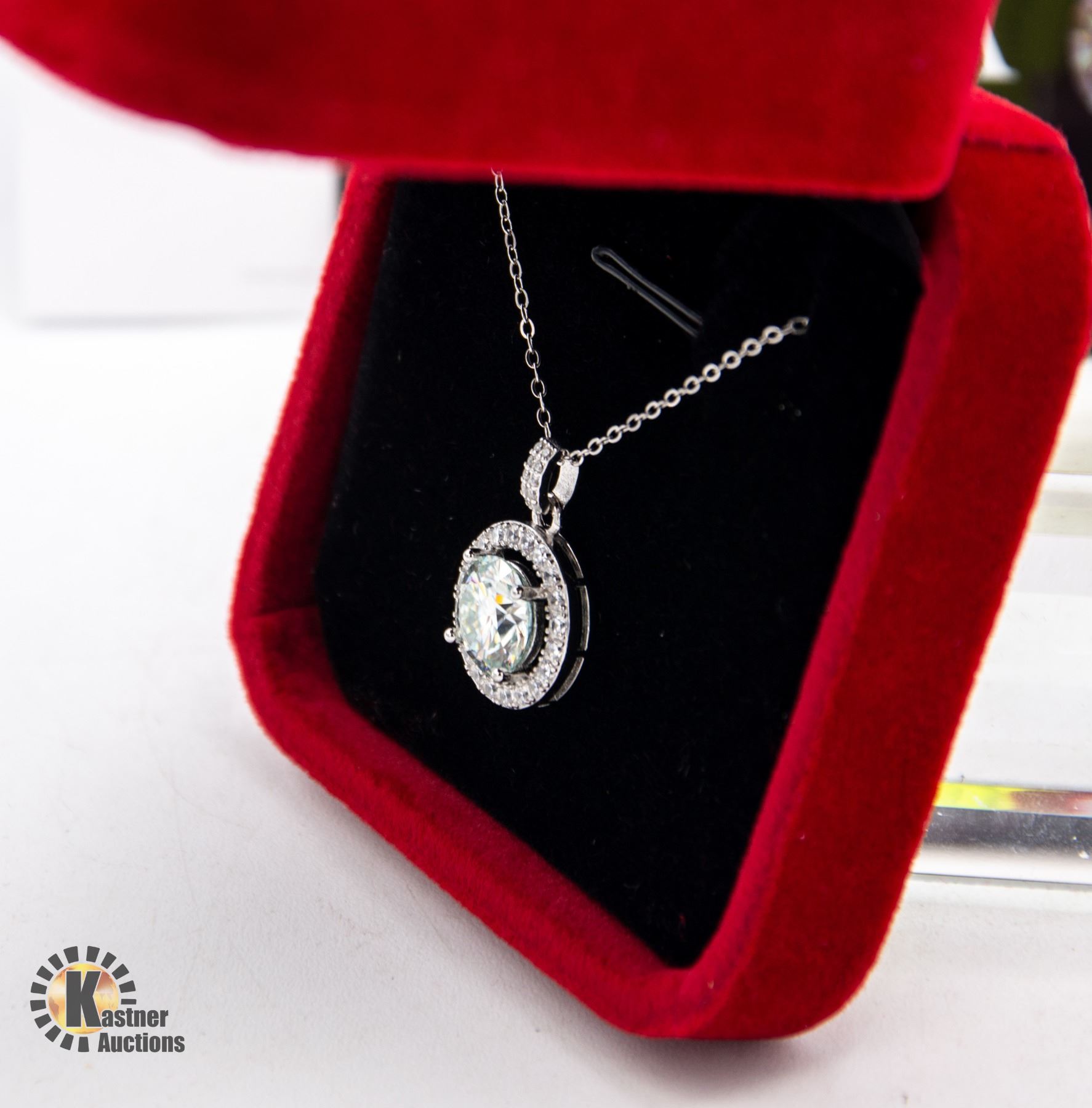 CENTER SURROUNDED BY HALO OF 30 MOISSANITE INCLUDING SOME SET IN BAIL SET IN S925 PENDANT AND NECKLACE APPRAISED VALUE $2,295.00