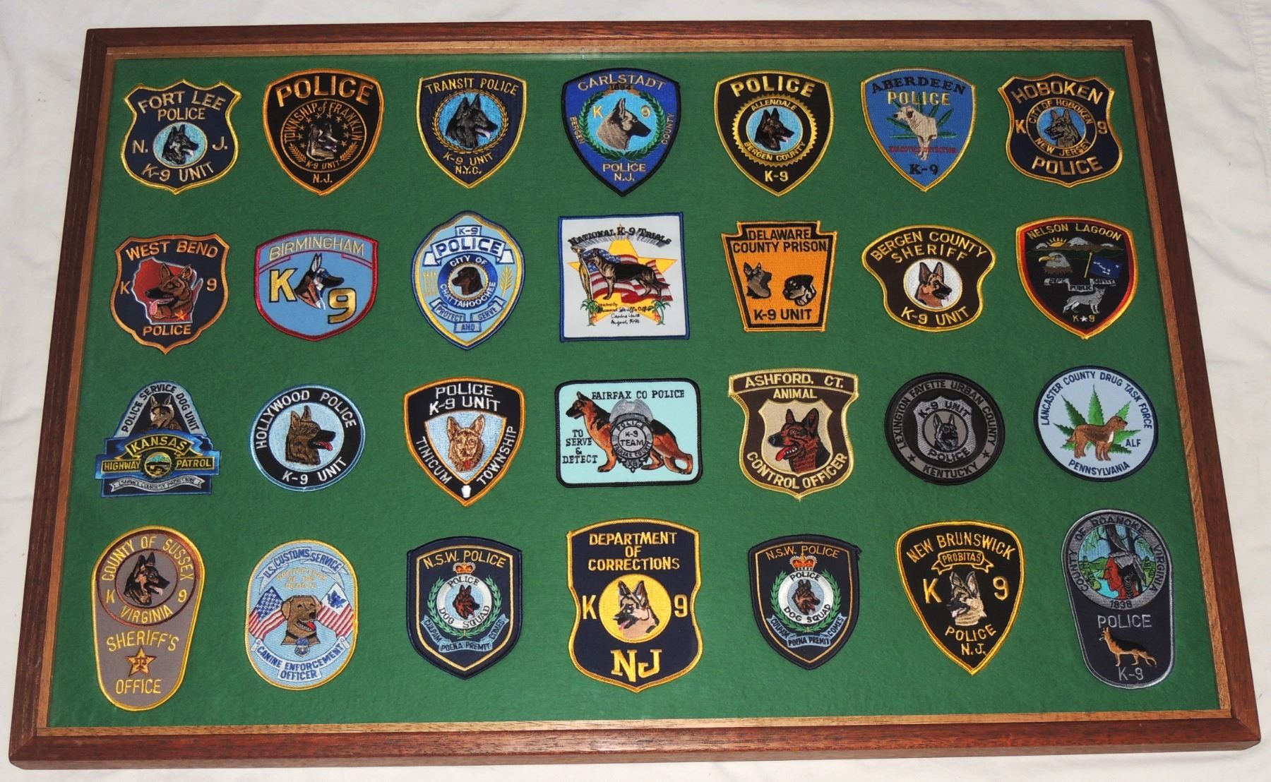 28 FRAMED PATCHES CANINE K-9 DOG POLICE UNITED STATES OF AMERICA USA LAW ENFORCEMENT INC. HOLLYWOOD NEW JERSEY LANCASTER DELAWARE COUNTY PRISON HOBOKEN NEW YORK CITY 25 X 37 INCHES IN SIZE
