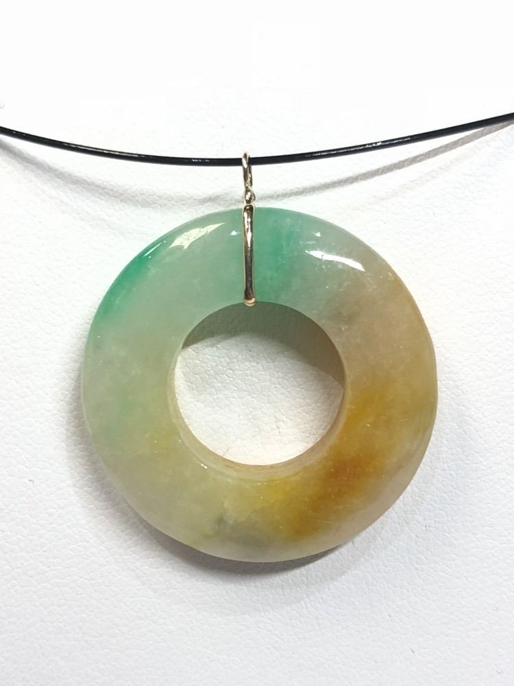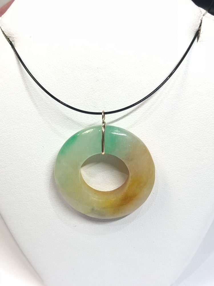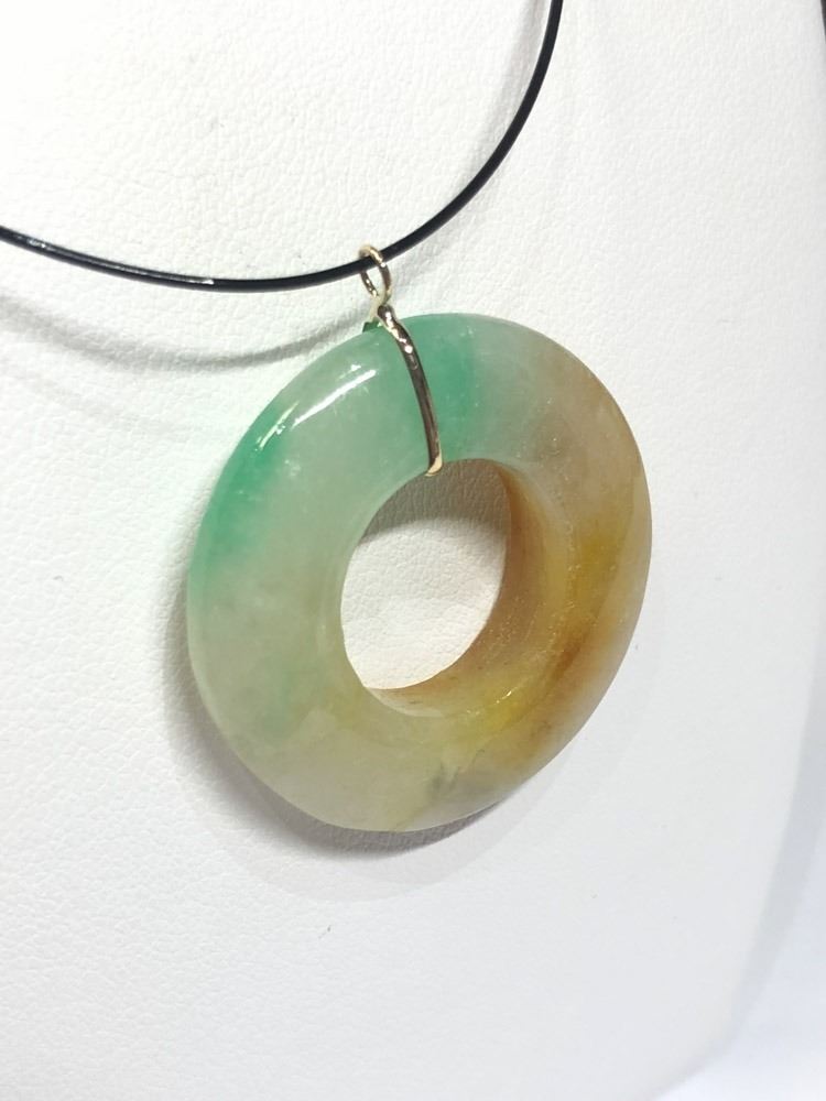 64 - JT56 - 14K YELLOW GOLD CIRCLE JADEITE PENDANT WITH CORD NECKLACE. JEWELLERY
