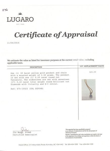 PENDANT W/ CHAIN, 1=.10cts. TANZANITE ROUND CUT, SIDE DIAMONDS 17=.10cts. T.W. ROUND BRILLIANT CUT, I1 CLARITY, H/I COLOR, APPRAISAL, RETAIL VALUE $625.00