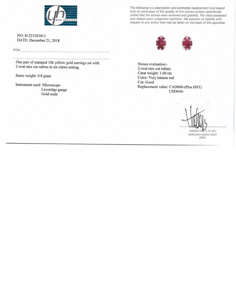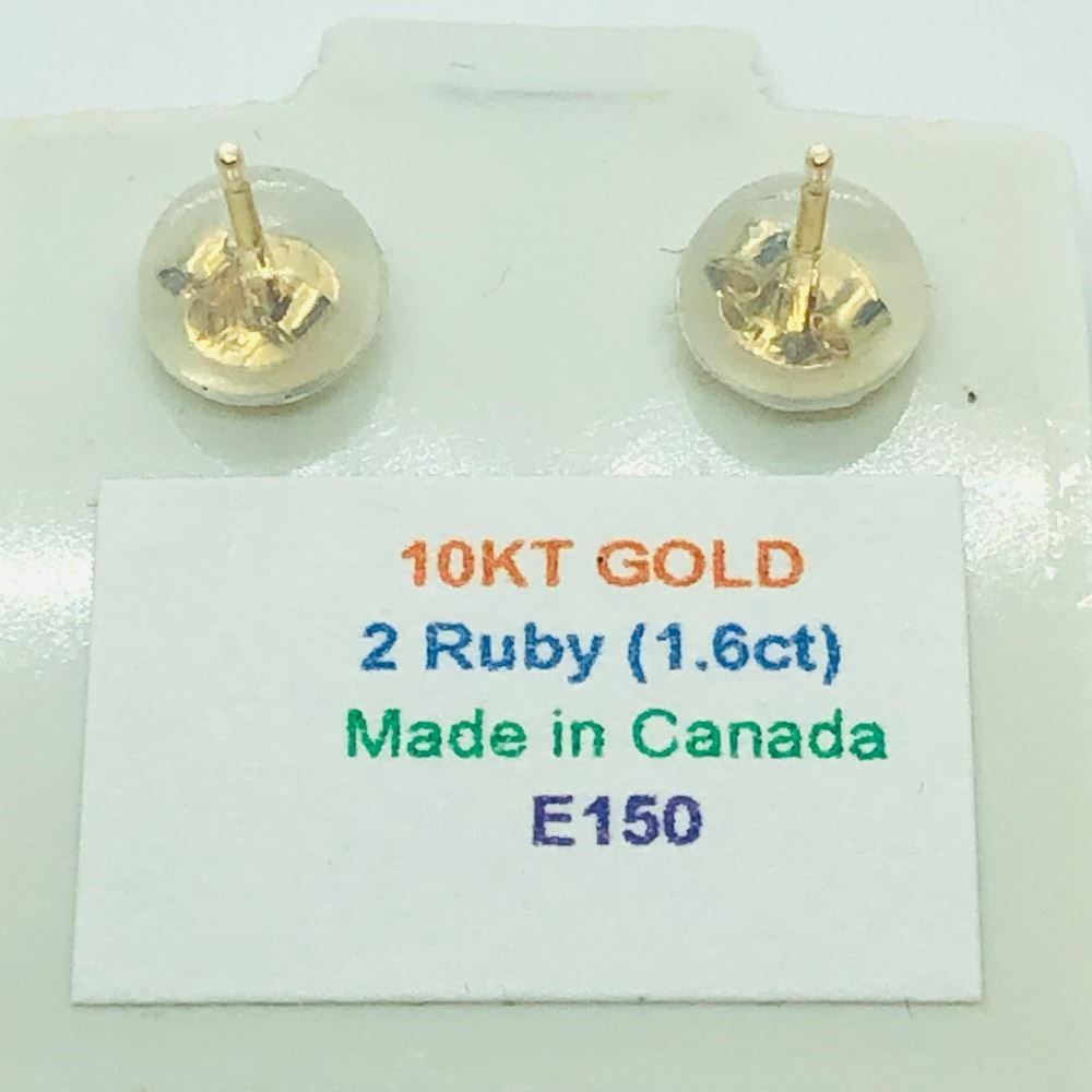 68 - JP346 - 10K YELLOW GOLD RUBY (1.6CTS) EARRINGS, MADE IN CANADA, WITH COA, APPRAISAL NOT FROM A LOCAL VERIFIED APPRAISER. SUGGESTED REPLACEMENT VALUE $600.00. JEWELRY