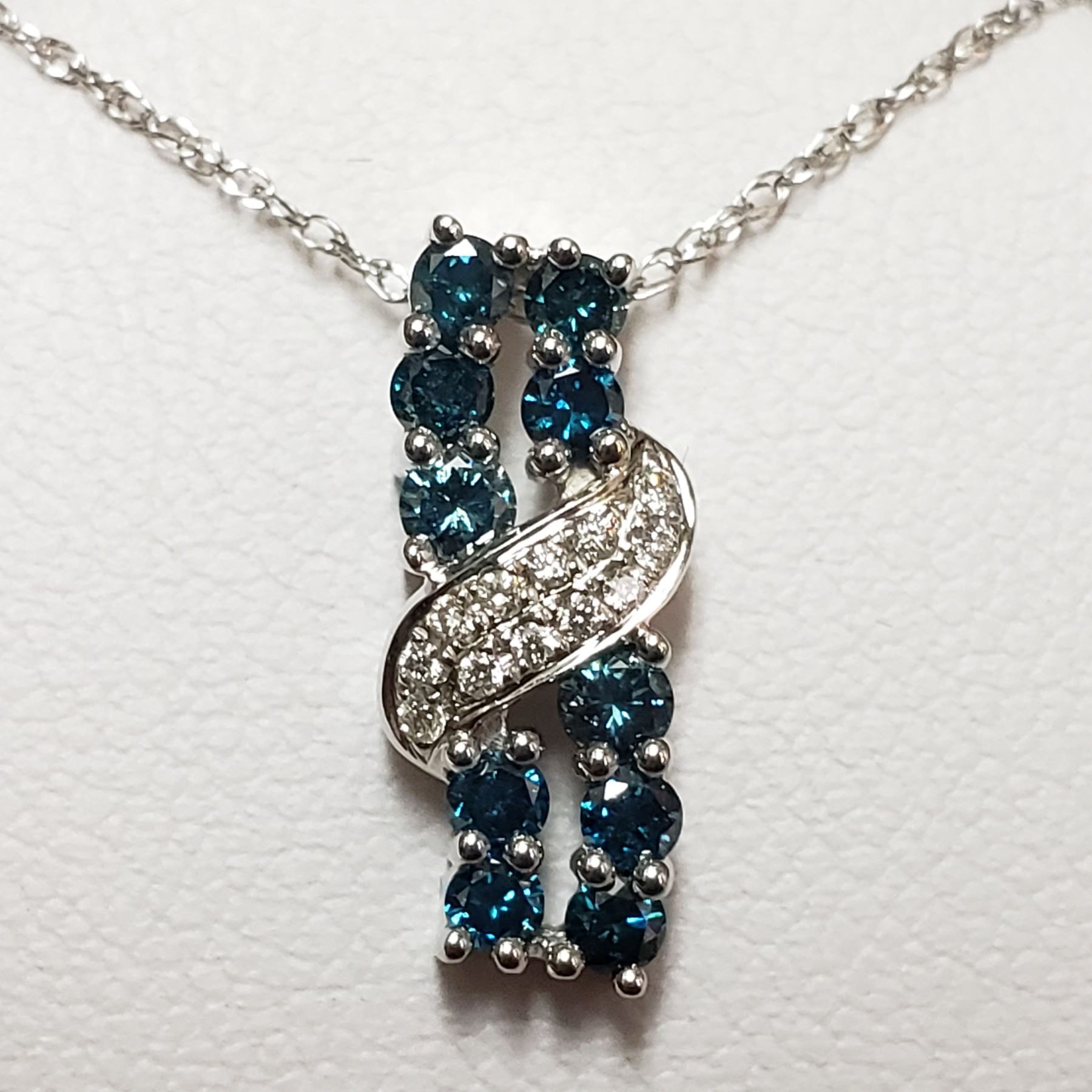 THE RIBBON STYLE PENDANT SECURES 10 ROUND BRILLIANT CUT FANCY COLORED BLUE, LABORATORY COLOR ENHANCED DIAMONDS (MEASURING 2.10 - 2.40 MM, CLARITY GRADE I 2-3) AND 12 ROUND BRILLIANT CUT DIAMONDS (MEASURING 0.90 MM, CLARITY GRADE SI 1-2, COLOR GRADE G-H, TOTAL DIAMOND WEIGH 0.49 CARAT) COMES WITH CERTIFICATE OF APPRAISAL FROM LOCAL APPRAISER, SUGGESTED INSURANCE COVERAGE $1400.00. JEWELLERY