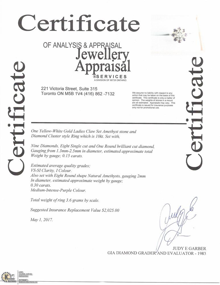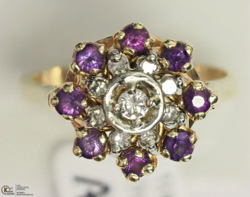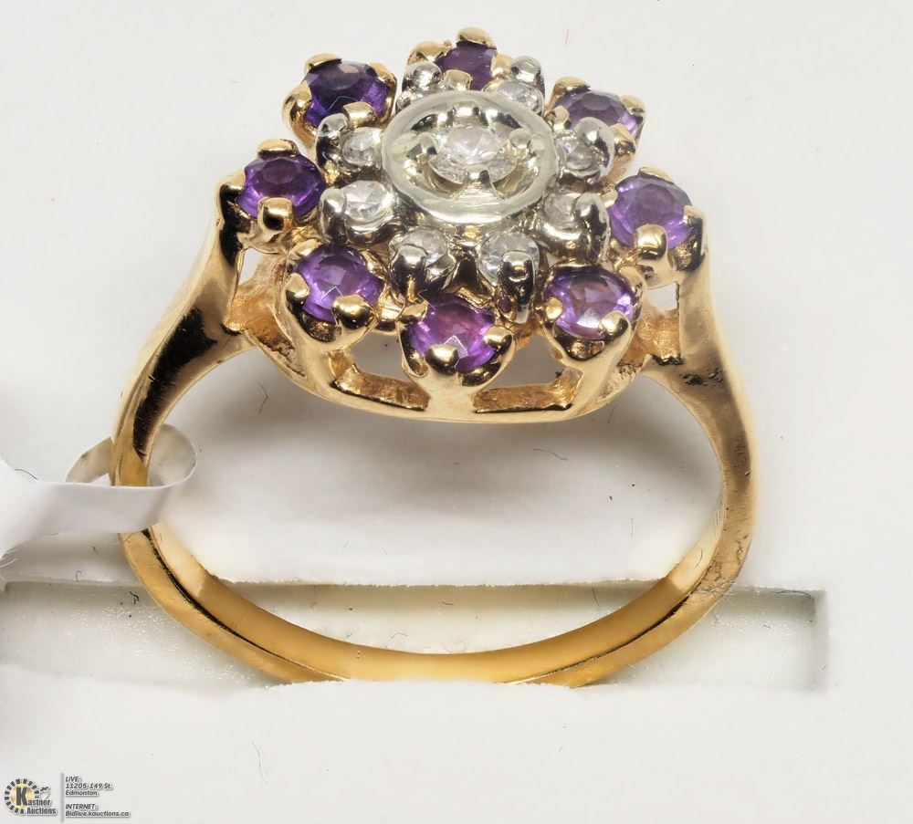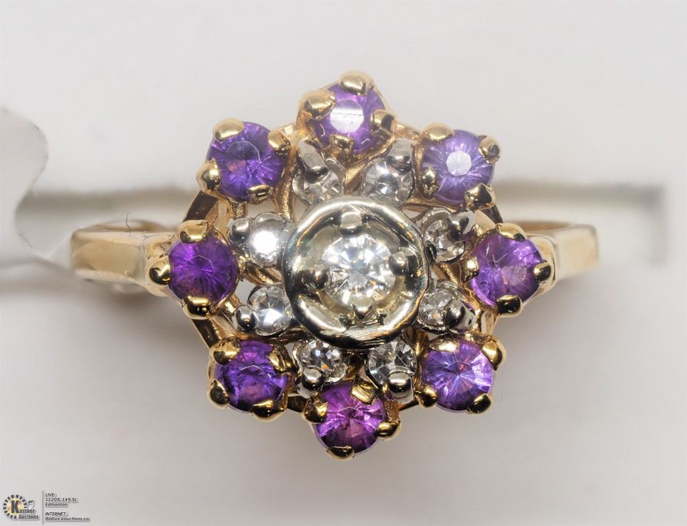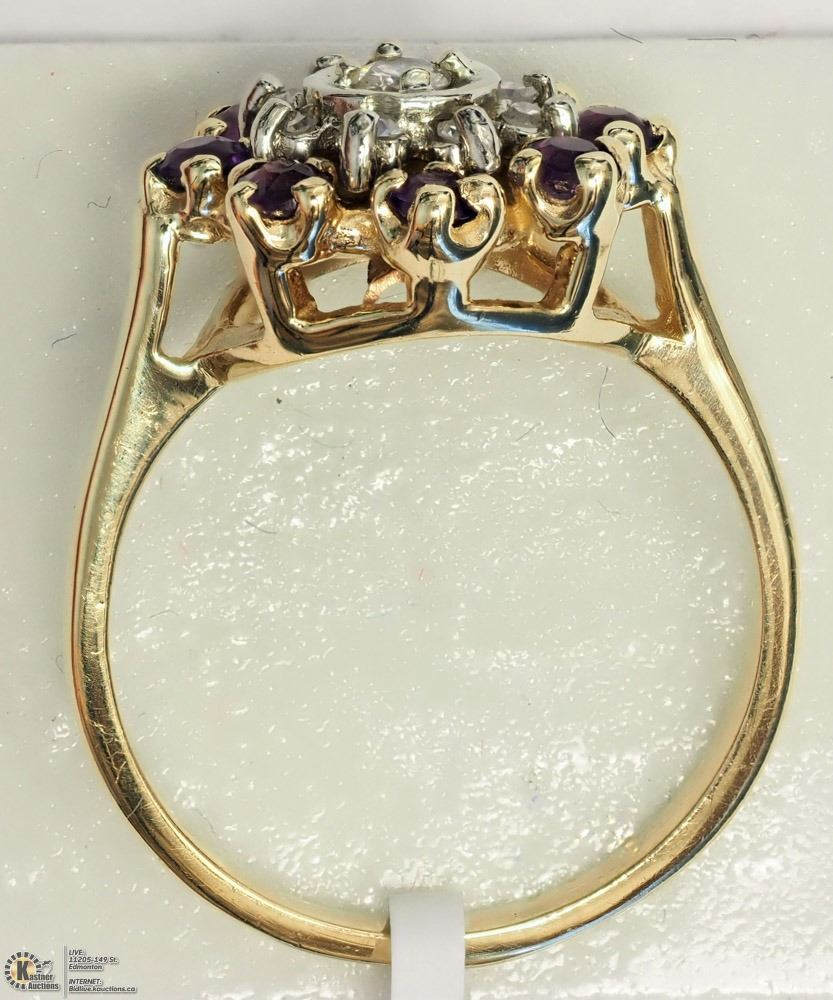 07 - GS55 - 10KT YELLOW & WHITE GOLD 8 AMETHYST (0.30CT) & DIAMOND (0.15CT) CLUSTER STYLE RING SIZE 6.25 W/COA. SUGGESTED REPLACEMENT VALUE $2,025.00