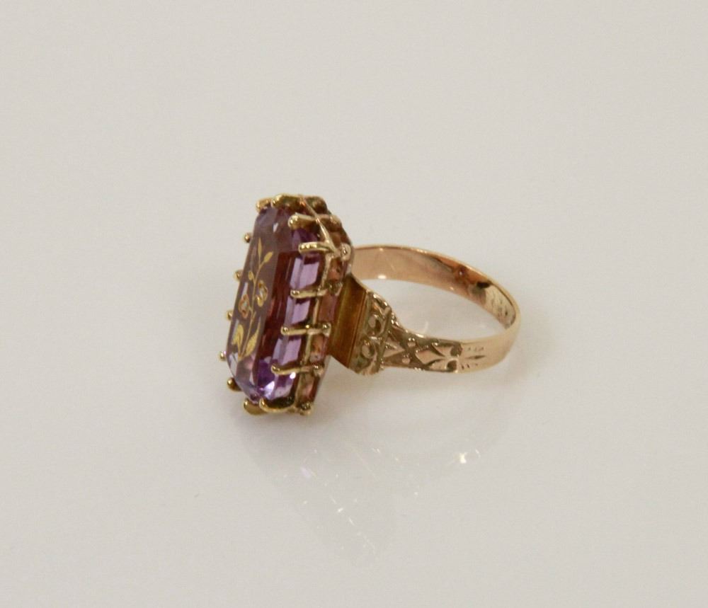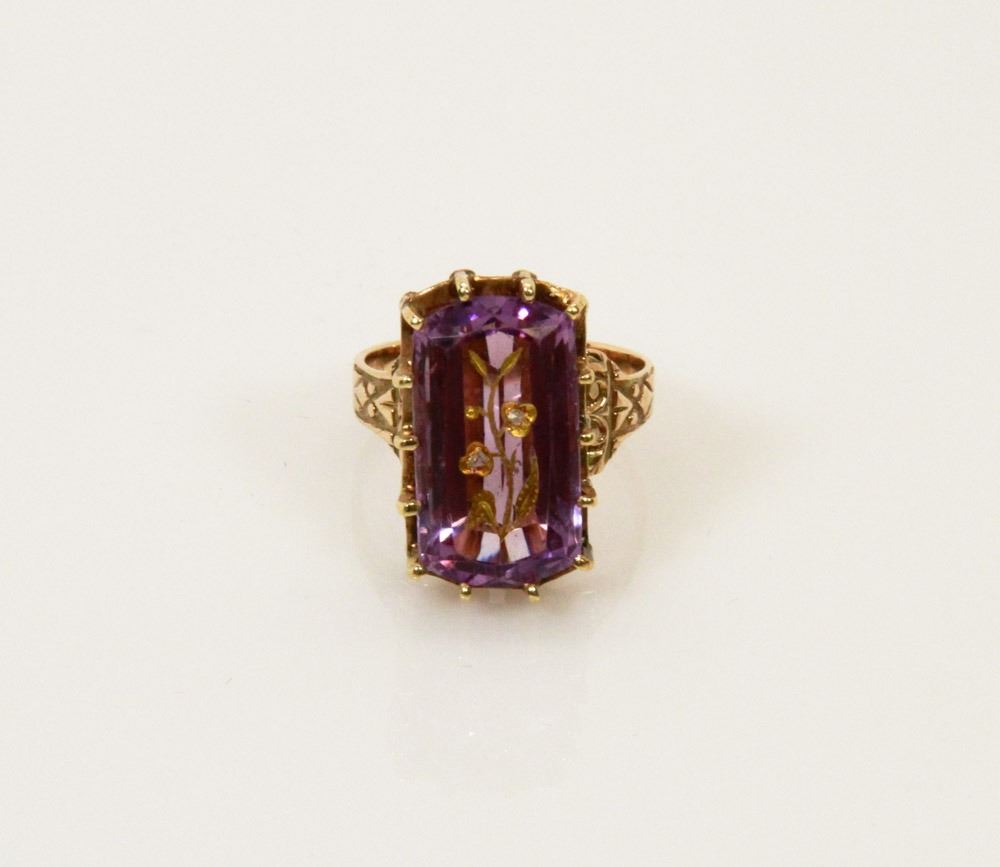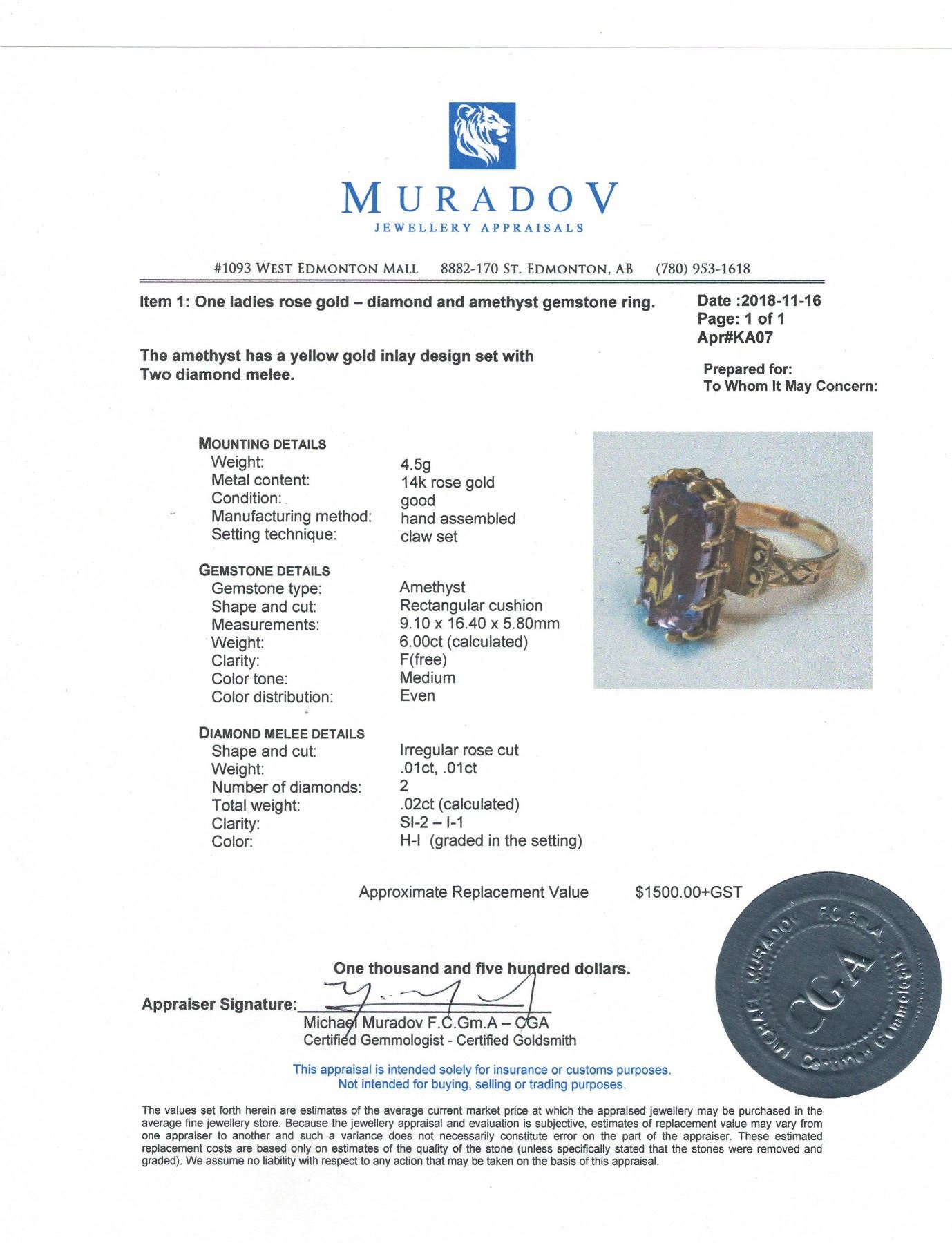 - AMETHYST (6.00CT) HAS A YELLOW GOLD INLAY DESIGN WITH TWO DIAMOND MELEE (IRREGULAR ROSE CUT, TOTAL WEIGHT OF .02CT), RING SIZE 5.25. APPRAISAL FROM LOCAL APPRAISER, APPROXIMATE REPLACEMENT VALUE $1500.00+GST. JEWELLERY