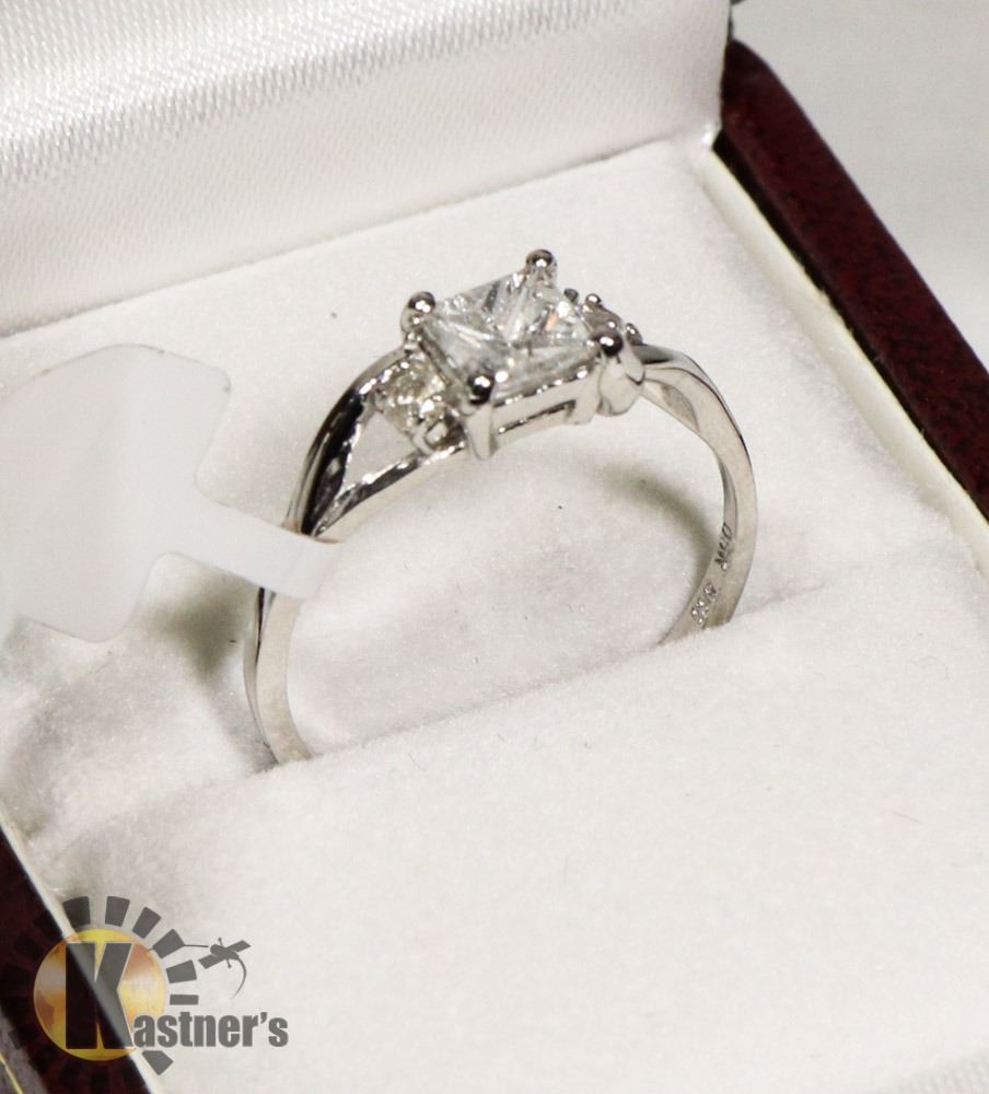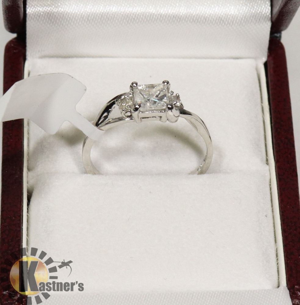 SIZE 6.25, ONE PRINCESS CUT DIAMOND (MEASURING 4.74 - 4.55 X 2.98 MM, CLARITY GRADE I 2-3, COLOR GRADE F, CARAT WEIGHT 0.52 CARATS), TWO ROUND BRILLIANT CUT DIAMONDS (MEASURING 2.10 - 2.20 MM, CLARITY GRADE I-3, COLOR GRADE H-I, WEIGHING TOTAL OF 0.05 CARATS), TOTAL DIAMOND WEIGHT 0.57 CARATS. COMES WITH CERTIFICATE OF APPRAISAL FROM LOCAL APPRAISER, SUGGESTED INSURANCE COVERAGE $1,600.00. JEWELLERY