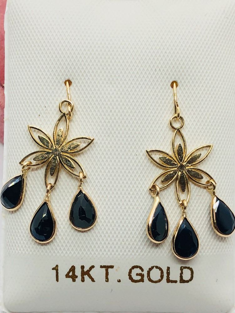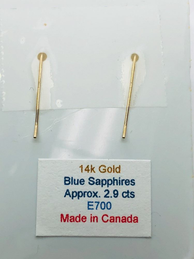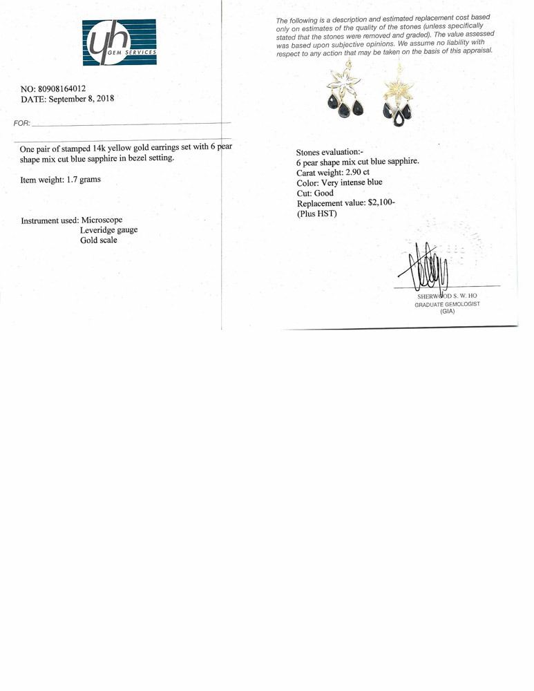 57 - JP263 - 14K YELLOW GOLD SAPPHIRE (2.9CTS) EARRINGS (~WEIGHT 1.7G), MADE IN CANADA W/COA, APPRAISAL NOT FROM A LOCAL VERIFIED APPRAISER. SUGGESTED REPLACEMENT VALUE $2100.00. JEWELLERY