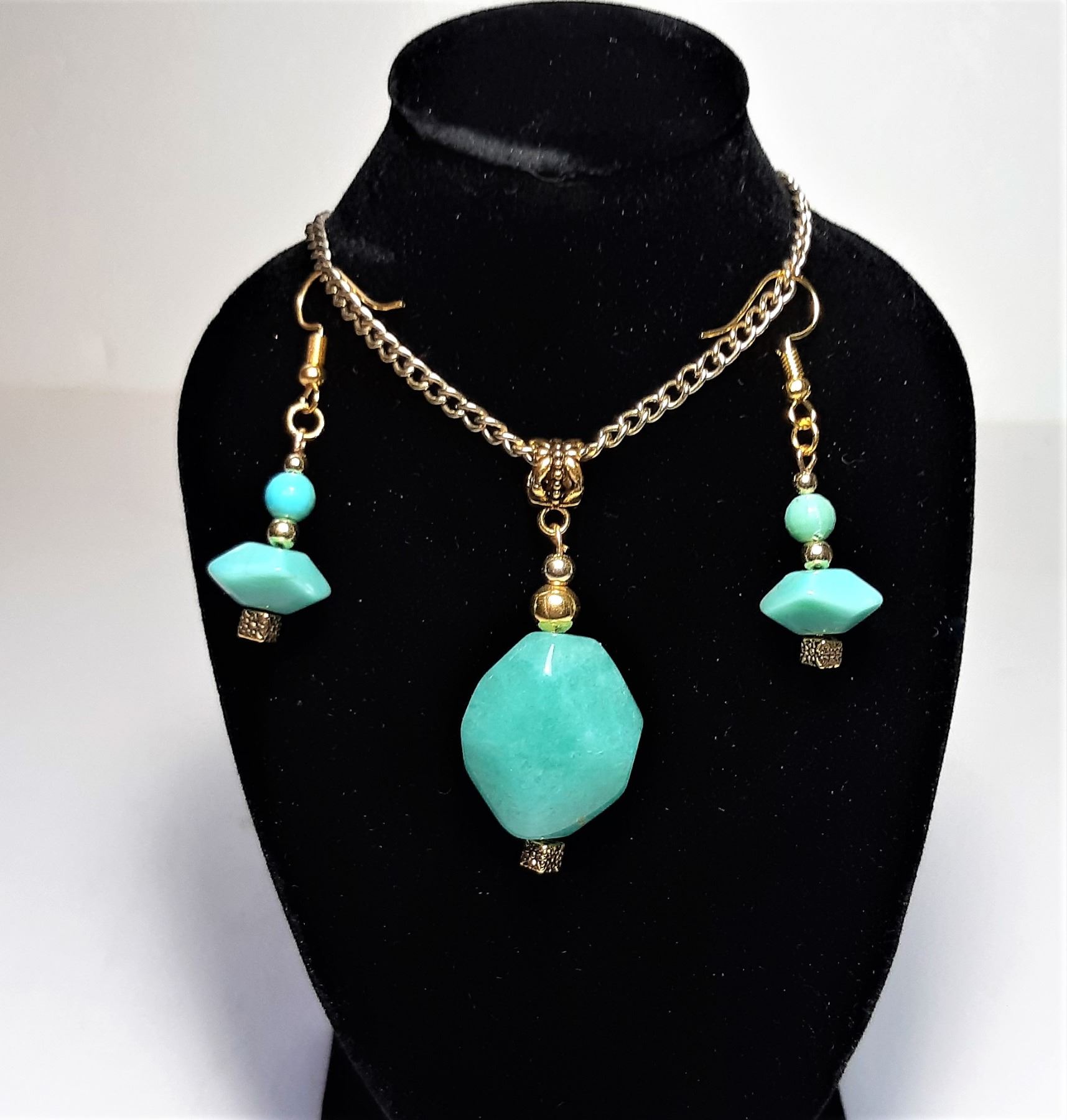 WITH GOLD TONE SETTING AND CHAIN AND MATCHING DROP EARRINGS. JEWELLERY
