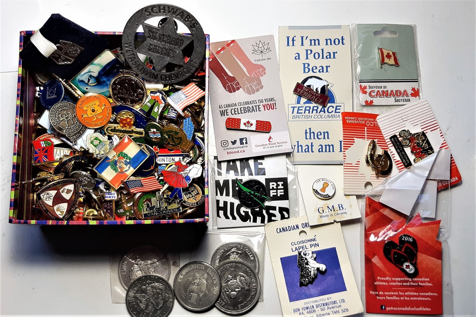 EDMONTON, OLYMPIC, CANADA INTERNATIONAL FLAGS, ALBERTA TOWNS PLUS 5 KLONDIKE DAYS TOKENS. COLLECTIBLES