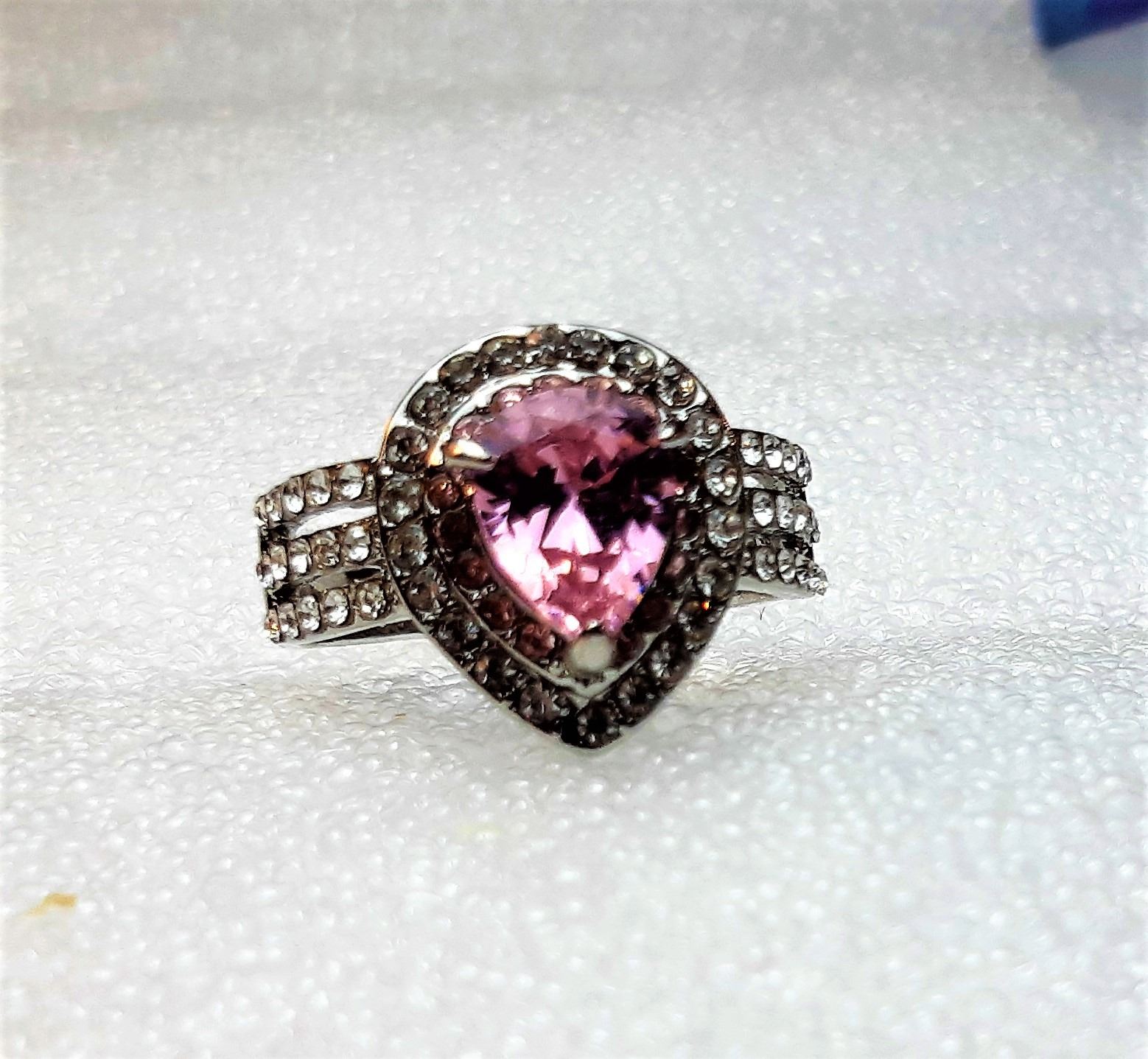 HALO STYLE RING WITH TRIPLE BAND SHOULDERS, SIZE 8. JEWELLERY