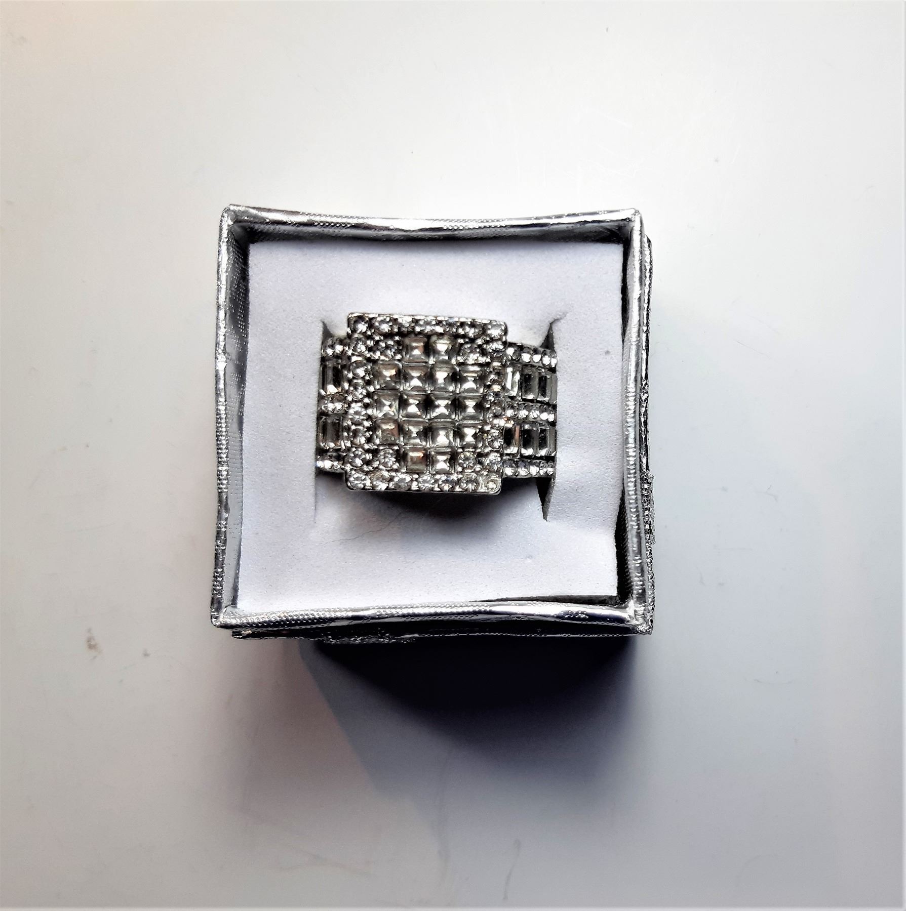 STATEMENT RING, SIZE 8, RING ON SHOULDERS FEATURES 5 ROWS OF ALTERNATING CHANEL SET & BAGETTE STONES & TOP OF RING IS SQUARE WITH 7 ROWS OF CONCENTRIC ROWS. JEWELRY