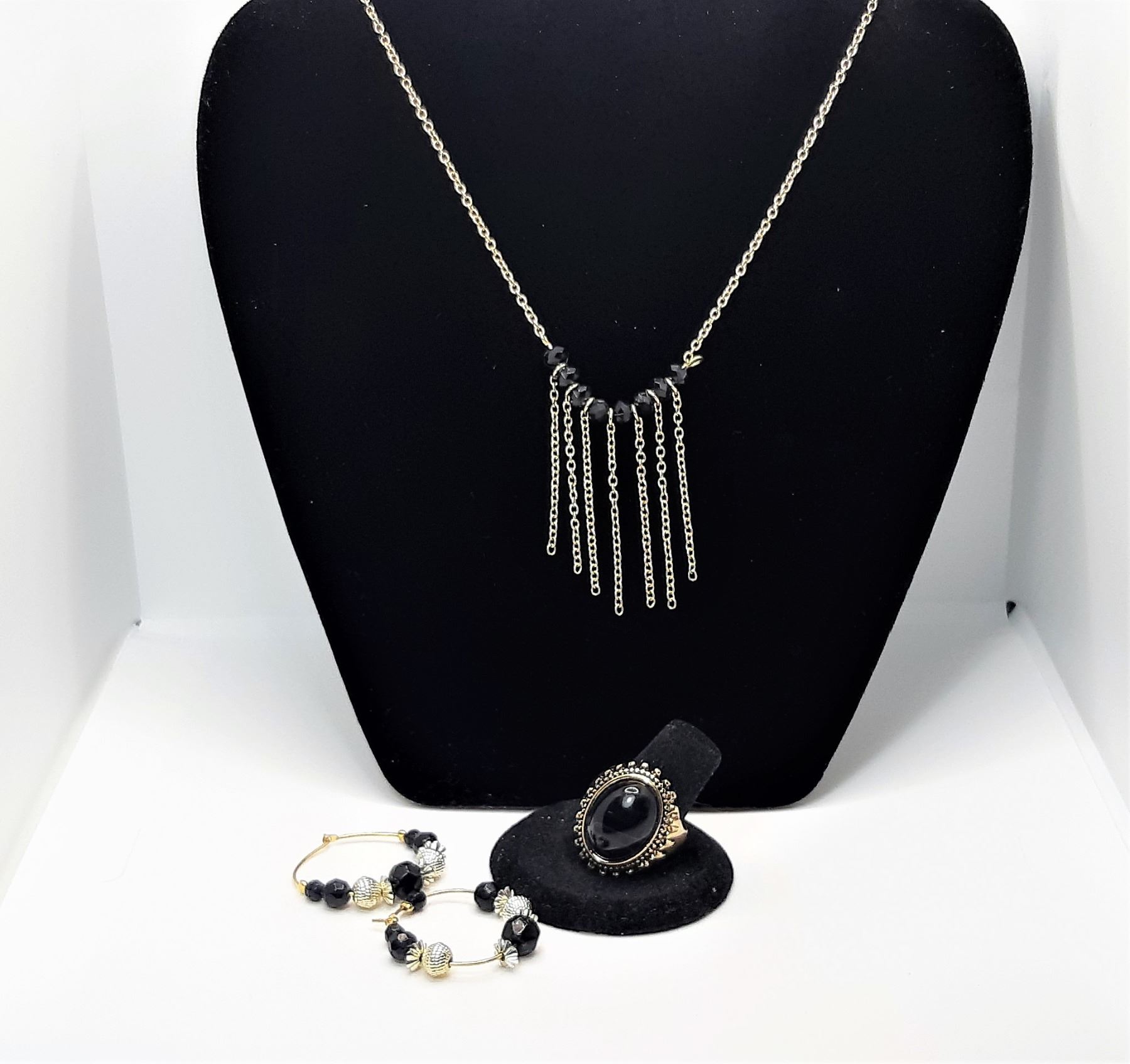 AND CRYSTAL JEWELRY, INCLUDES OVAL SHAPED ONYX RING, SIZE 8, HOOP EARRINGS, AND PENDANT WITH CHAIN ACCENTS ON 24" CHAIN WITH 2" EXTENDER. JEWELRY