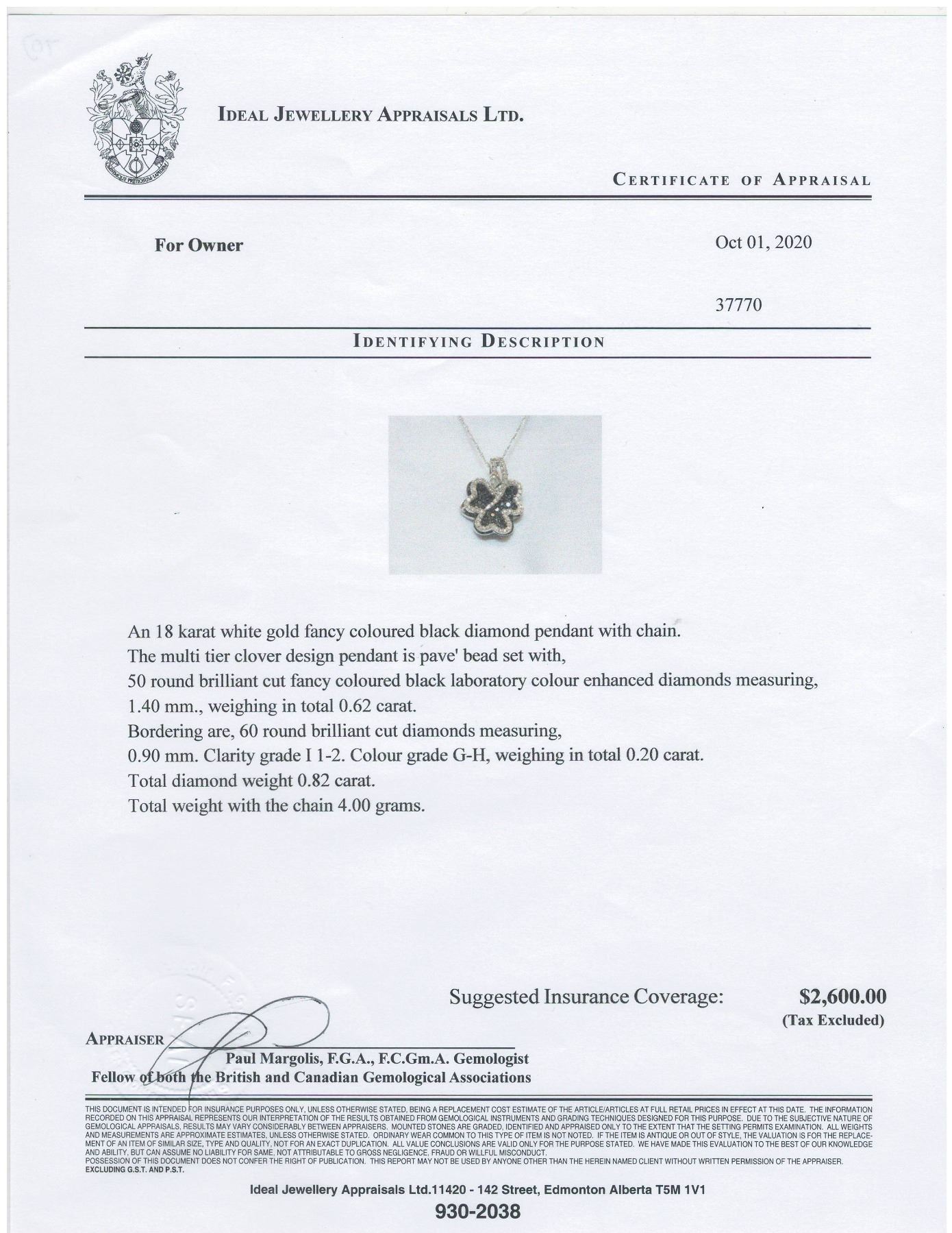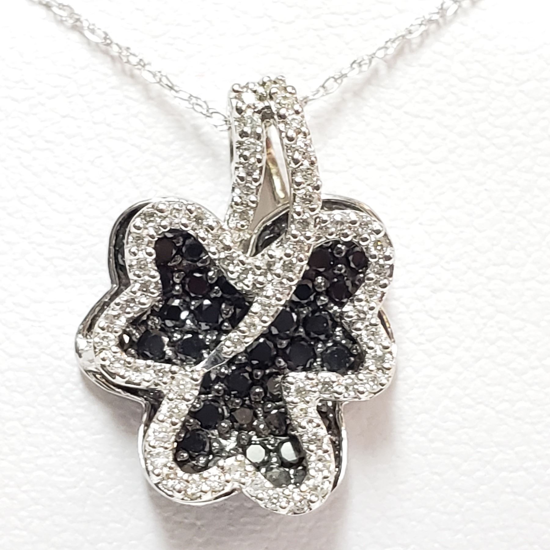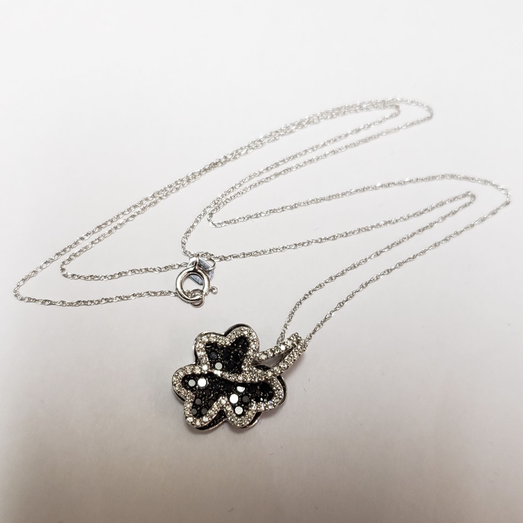 CHAIN. THE MULTI TIER CLOVER DESIGN PENDANT IS PAVE' BEAD SET WITH 50 ROUND BRILLIANT CUT FANCY COLORED BLACK LABORATORY COLOR ENHANCED DIAMONDS (MEASURING 1.40 MM., WEIGHING IN TOTAL 0.62 CARAT) BORDERING ARE 60 ROUND BRILLIANT CUT DIAMONDS(MEASURING 0.90 MM, CLARITY GRADE I 2, COLOR GRADE G-H, WEIGHING IN TOTAL 0.20 CARAT) COMES WITH CERTIFICATE OF APPRAISAL FROM LOCAL APPRAISER, SUGGESTED INSURANCE COVERAGE $2600.00. JEWELLERY
