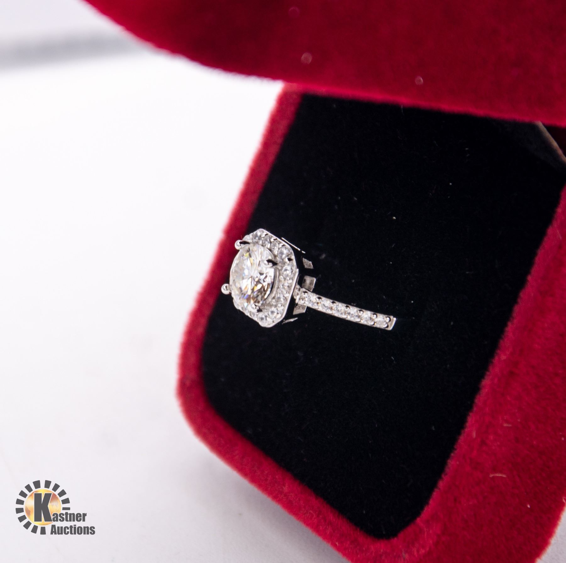 VS SET IN STERLING SILVER SURROUNDED BY A HALO OF 16 CUBIC ZIRCONIUM WITH 6 MORE IN EACH SHOULDER RING SIZE 7 APPRAISED VALUE $825.00