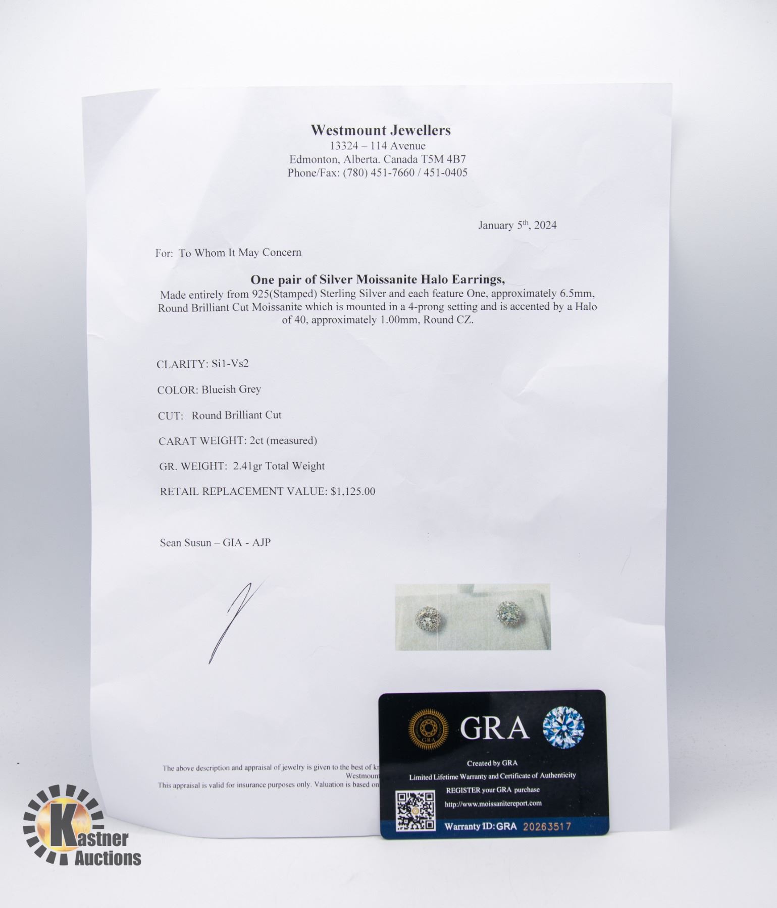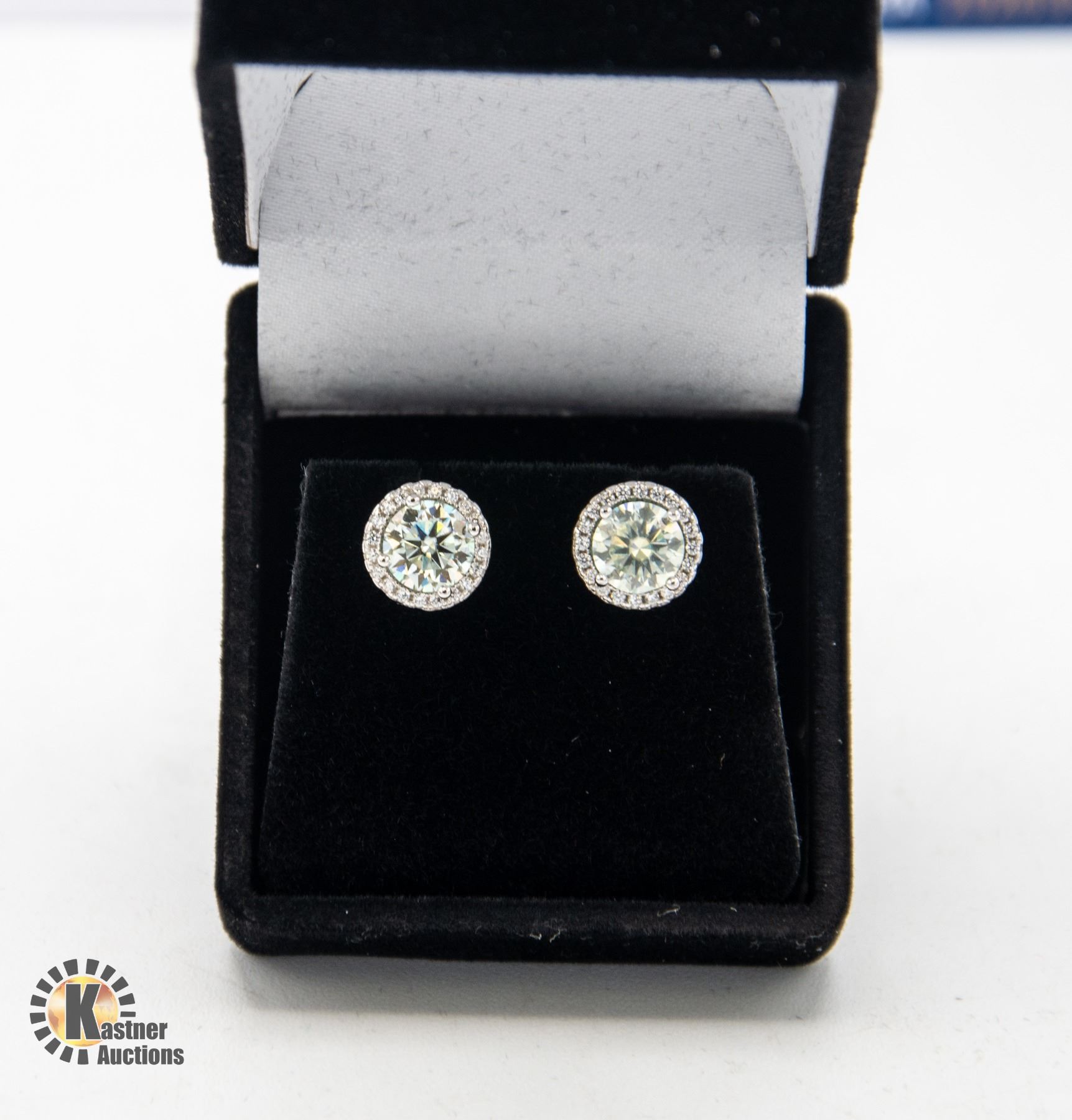 APPROXIMATELY 1.00 CARAT EACH SET IN 925 STERLING SILVER WITH A HALO WITH 40 STONES AND SCREW BACK. THE APPRAISED VALUE IS $1,125.00