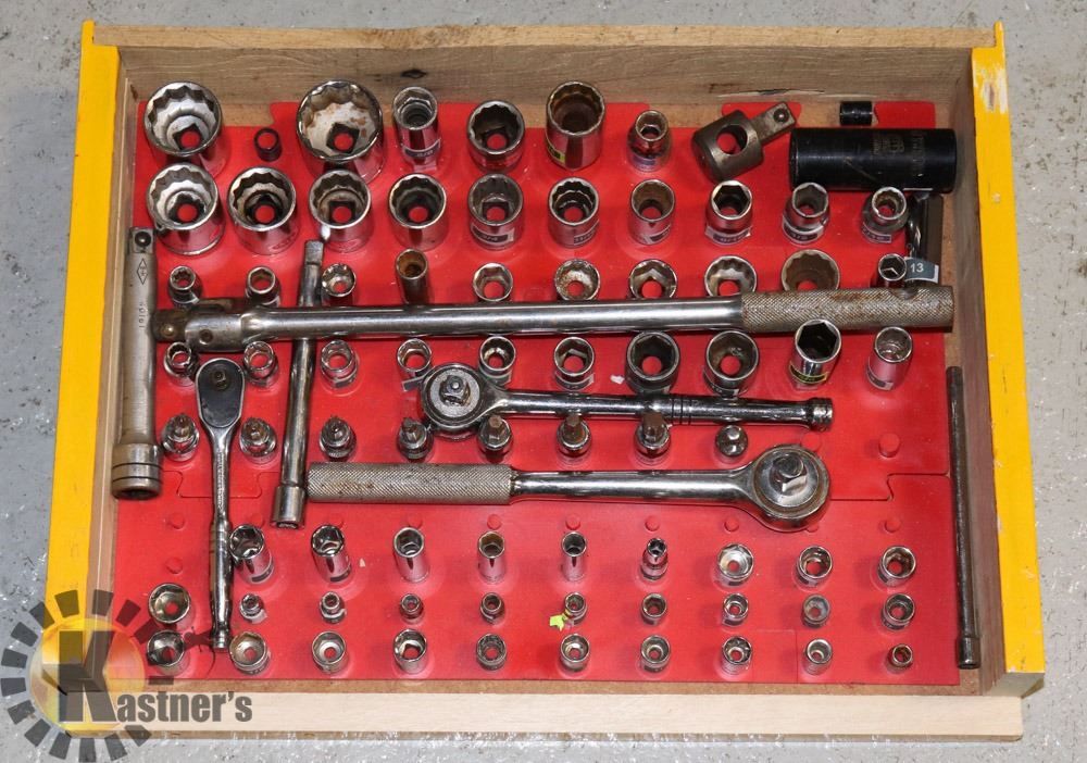 74 PIECE RATCHET SET 1/2, 3/8, 1/4", LABELED 17- 1/2", 20- 3/8", 30- 1/4" 1/4, 3/8 & 1/2" RATCHETS, 1/2" BREAKER BAR & EXTENSIONS.