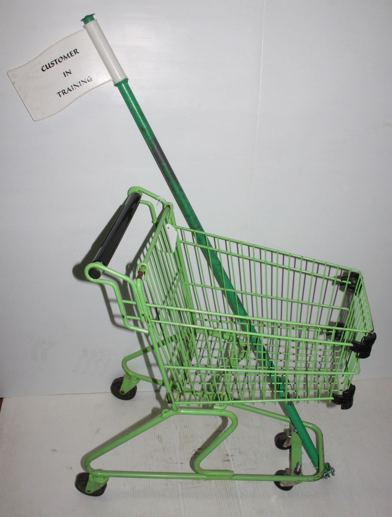 THIS LOT. Vintage Green shopping cart with "Customer in training" pole