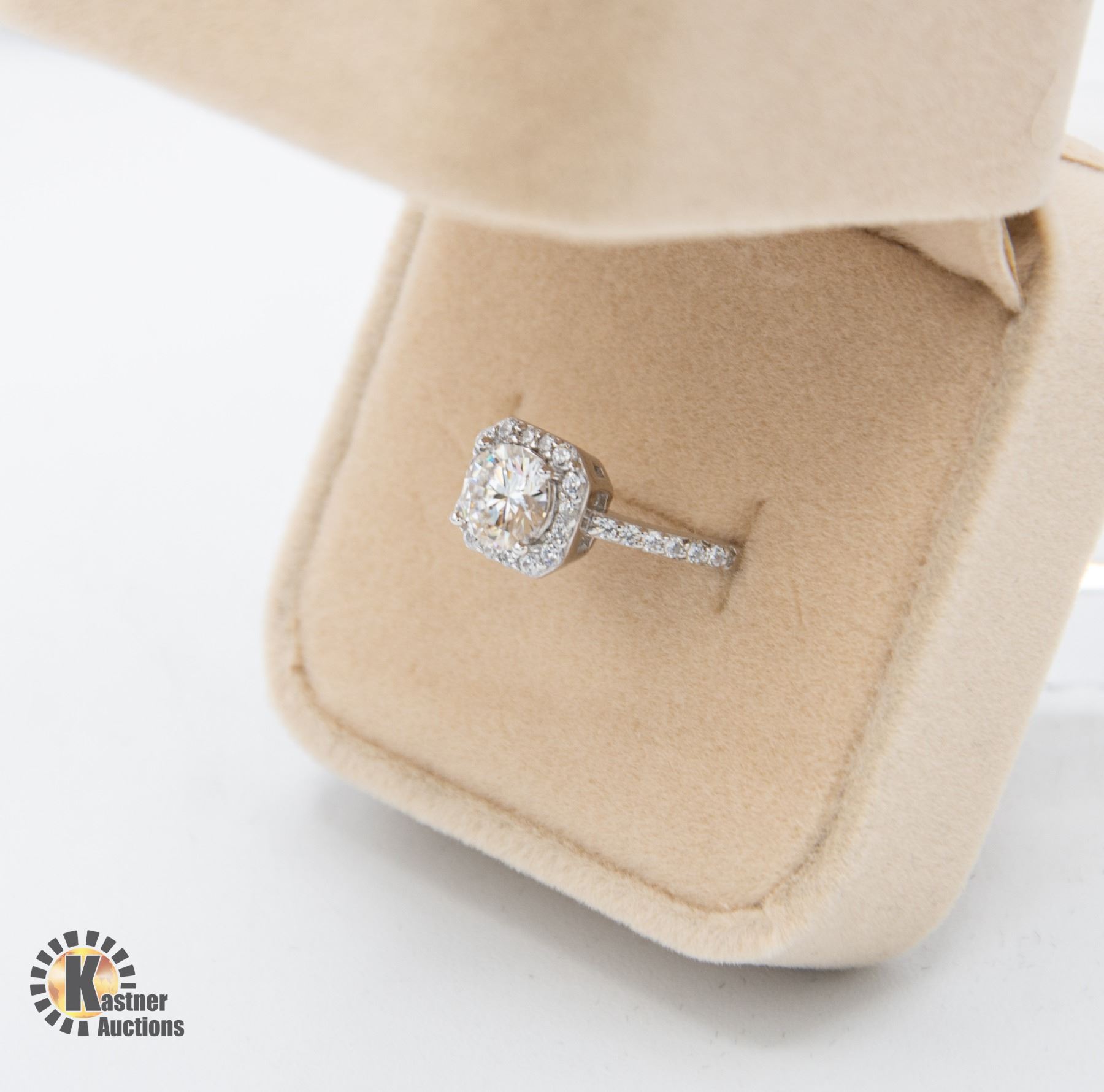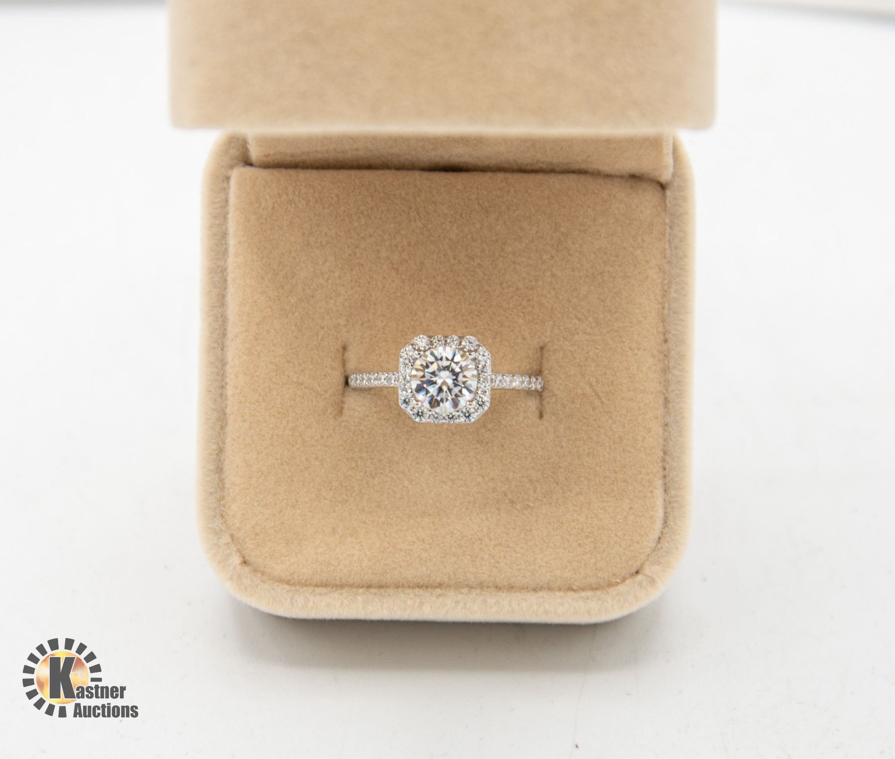CENTER WITH SQUARE SHAPED HALO WITH CUBIC ZIRCONIUM SET THERE WITH MORE IN SHOULDERS WEIGHING A TOTAL 0.30 CARATS SET IN STERLING SILVER RING SIZE 5 APPRAISED VALUE $1,700.00