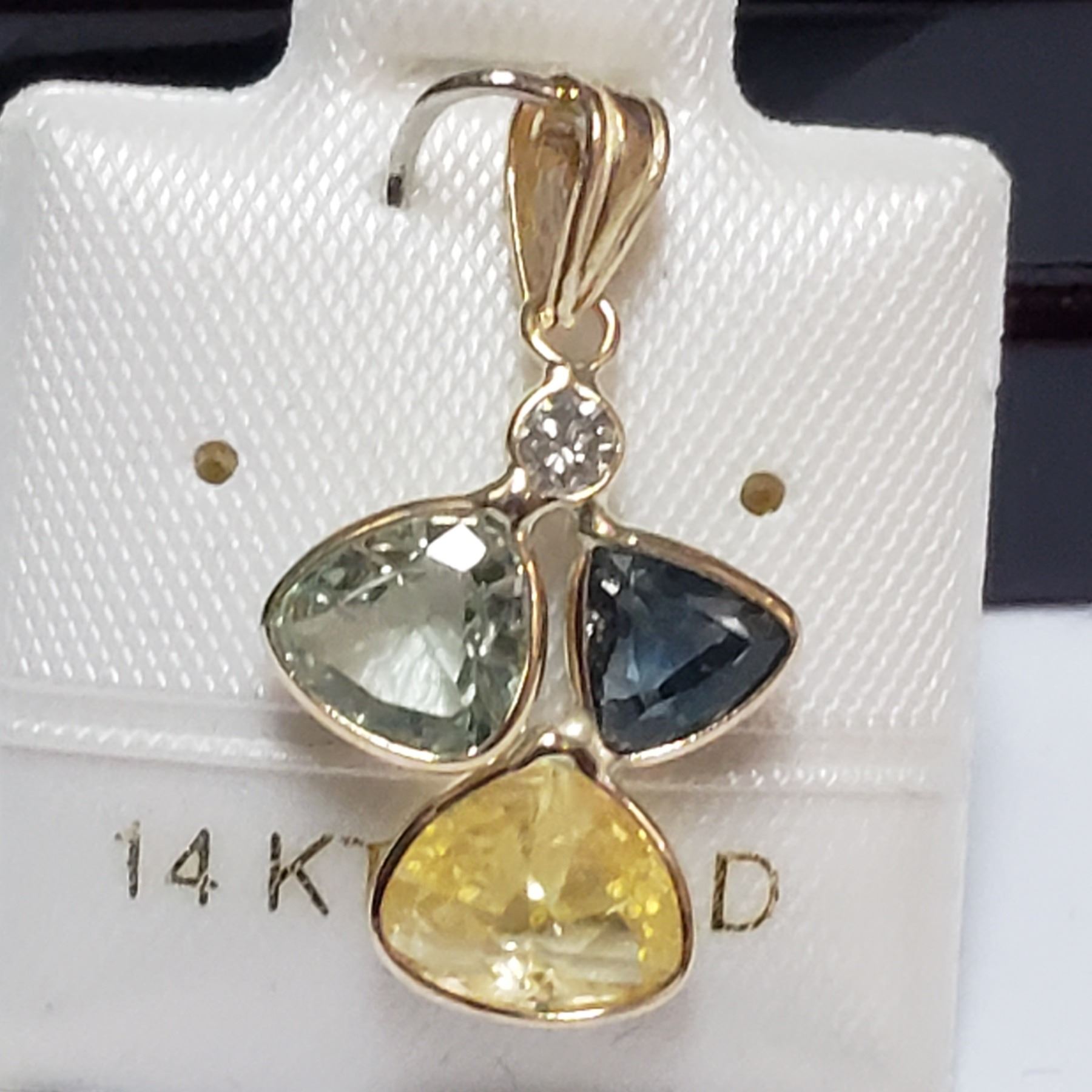 THE BEZEL SETTINGS SECURE THREE VARI COLORED PEAR SHAPED NATURAL SAPPHIRES (MEASURING TO 6.20 - 7.60 X 3.06 MM, HUES GREEN, YELLOW AND, TEAL. TOTAL SAPPHIRE WEIGHT 2.50 CARATS) COMES WITH CERTIFICATE OF APPRAISAL FROM LOCAL APPRAISER,SUGGESTED INSURANCE COVERAGE $1200.00. JEWELLERY