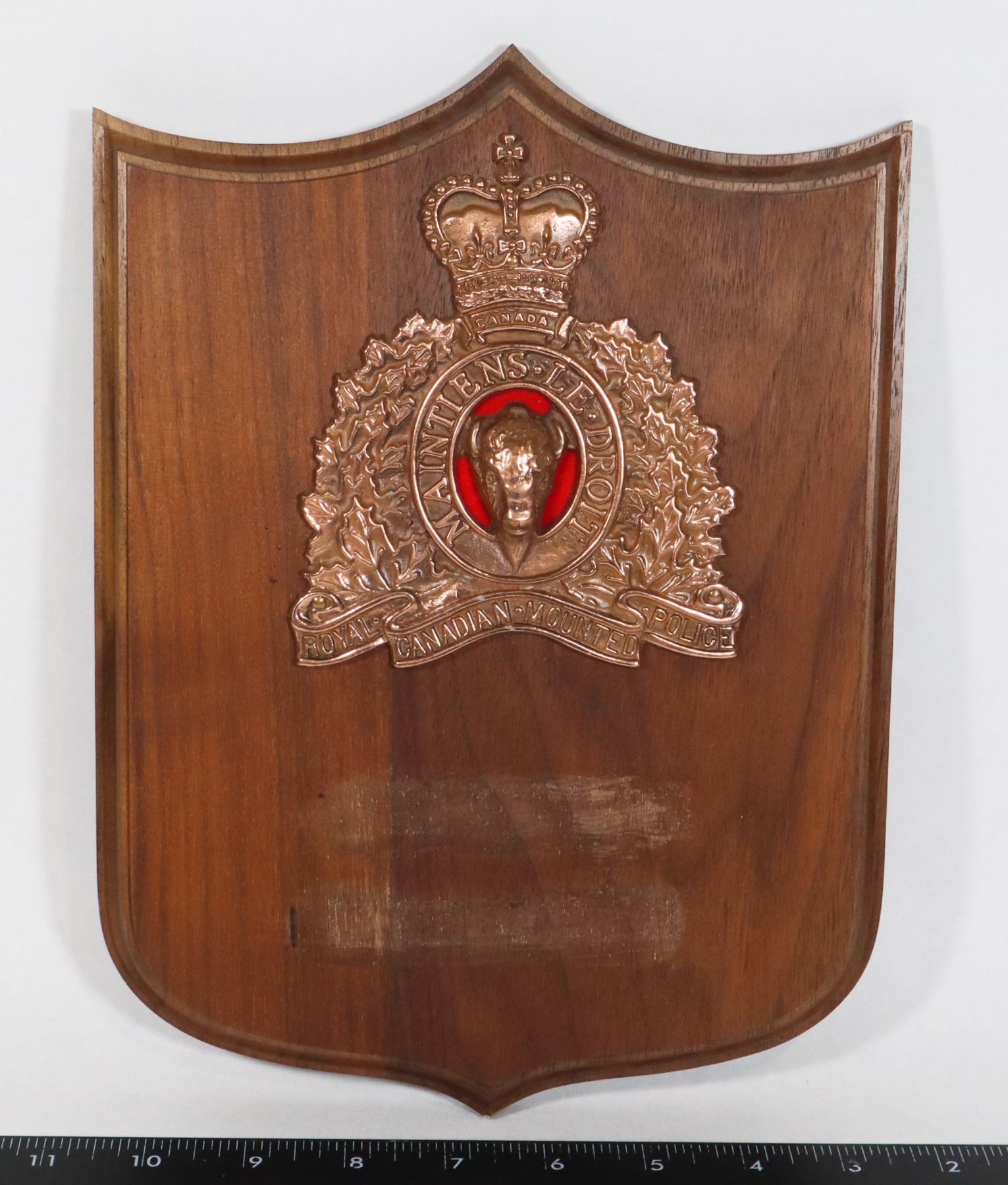 11 INCHES BY 8 INCHES SHIELD PLAQUE WORN CONDITION ROYAL CANADIAN MOUNTED POLICE BRASS BADGE QUEEN ELIZABETH II QEII