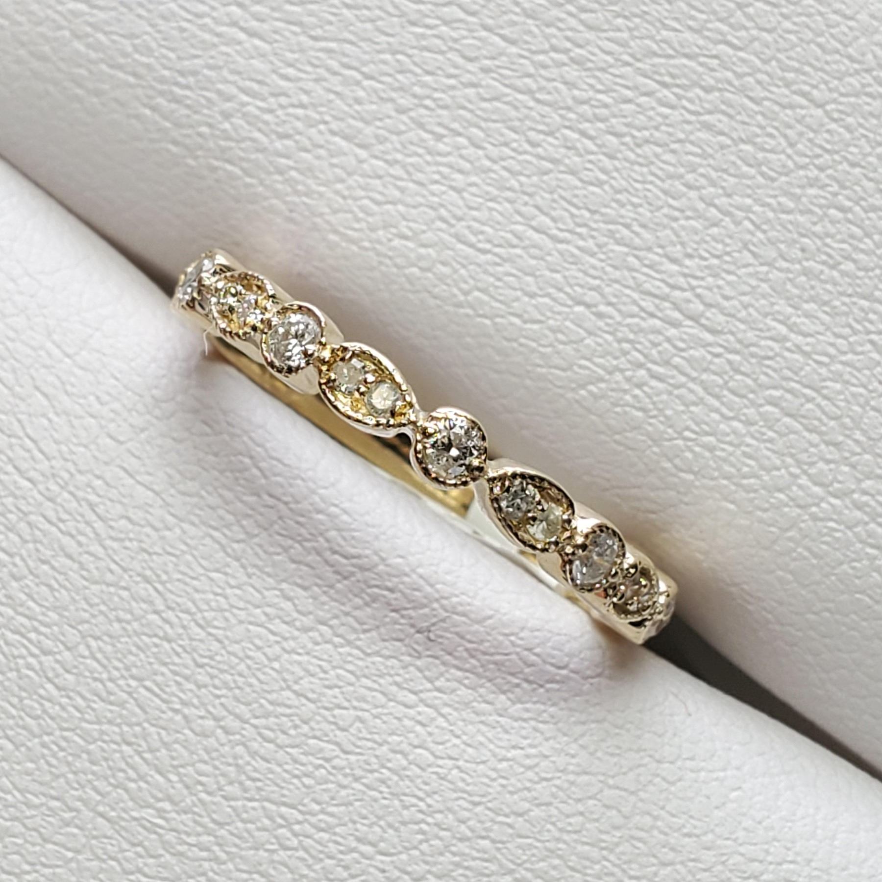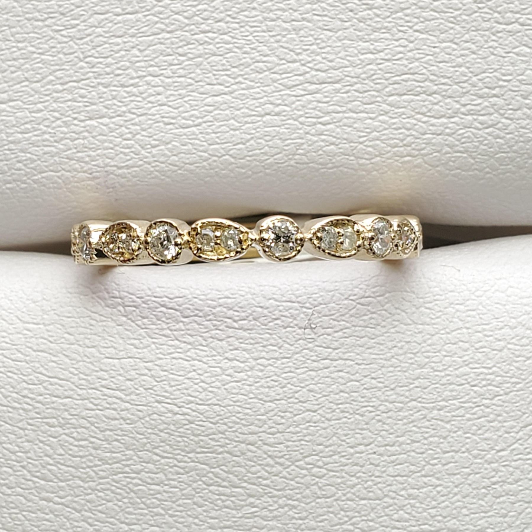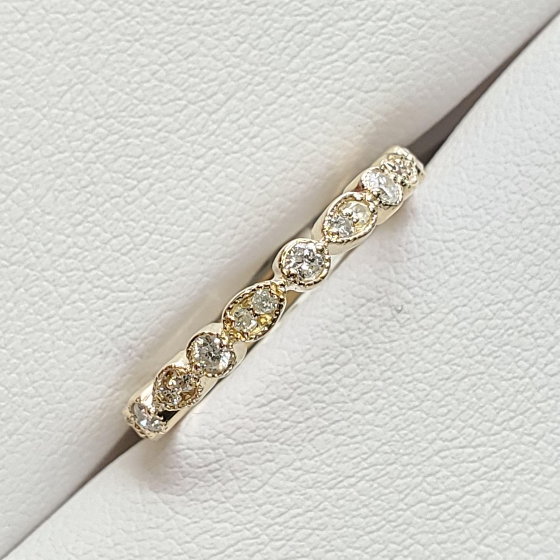 SIZE 6.75 A 10 KARAT YELLOW GOLD DIAMOND RING. THE MILLIGRAIN TEXTURED RING TOP IS SET WITH, 17 ROUND BRILLIANT CUT DIAMONDS MEASURING, 1.20- 1.90 MM.CLARITY GRADE 1-2. COLOUR GRADE H-1. CARAT WEIGHT TOTAL0.27 CARAT. TOTAL WEIGHT 1.90 GRAMS.CERTIFICATE OF APPRAISAL FROM LOCAL APPRAISER, SUGGESTED INSURANCE COVERAGE $800.00.