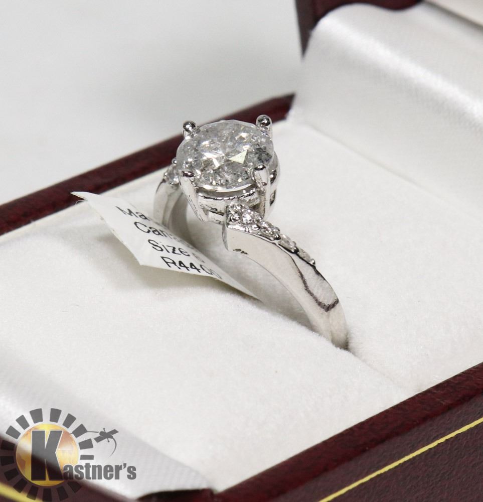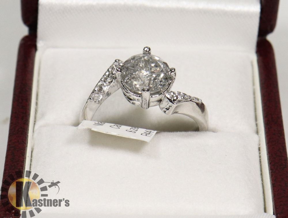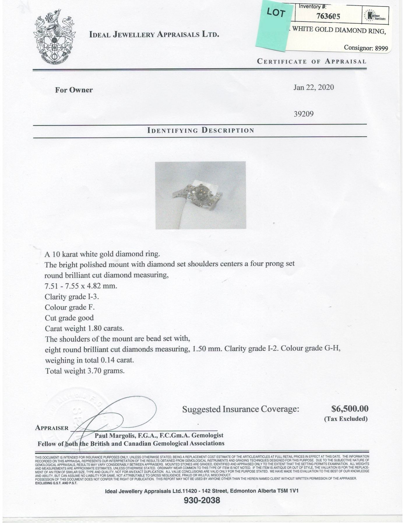 SIZE 6.5, ONE ROUND BRILLIANT CUT DIAMOND (MEASURING 7.51 - 7.55 X 4.82MM, CLARITY GRADE I-3, COLOR GRADE F, CUT GRADE GOOD, CARAT WEIGHT 1.80 CARATS), EIGHT ROUND BRILLIANT CUT DIAMONDS (MEASURING 1.50MM, CLARITY GRADE I-2, COLOR GRADEG-H, WEIGHING 0.14 CARATS). COMES WITH CERTIFICATE OF APPRAISAL FROM LOCAL APPRAISER, SUGGESTED INSURANCE COVERAGE $6,500.00. JEWELLERY