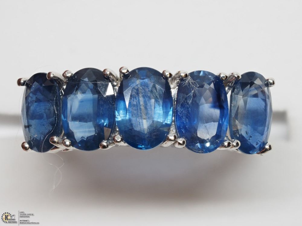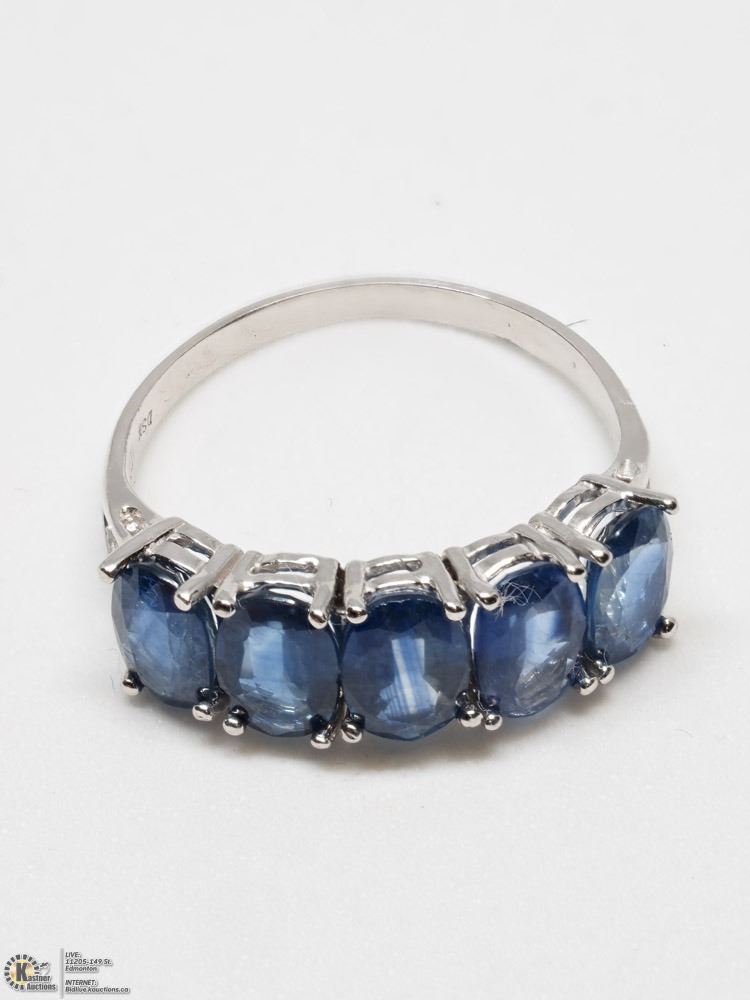 08 - GS55 - 10KT WHITE GOLD 5 SAPPHIRE (2.50CT) CLASSIC STYLE RING SIZE 6.25 W/COA. SUGGESTED REPLACEMENT VALUE $1,200.00