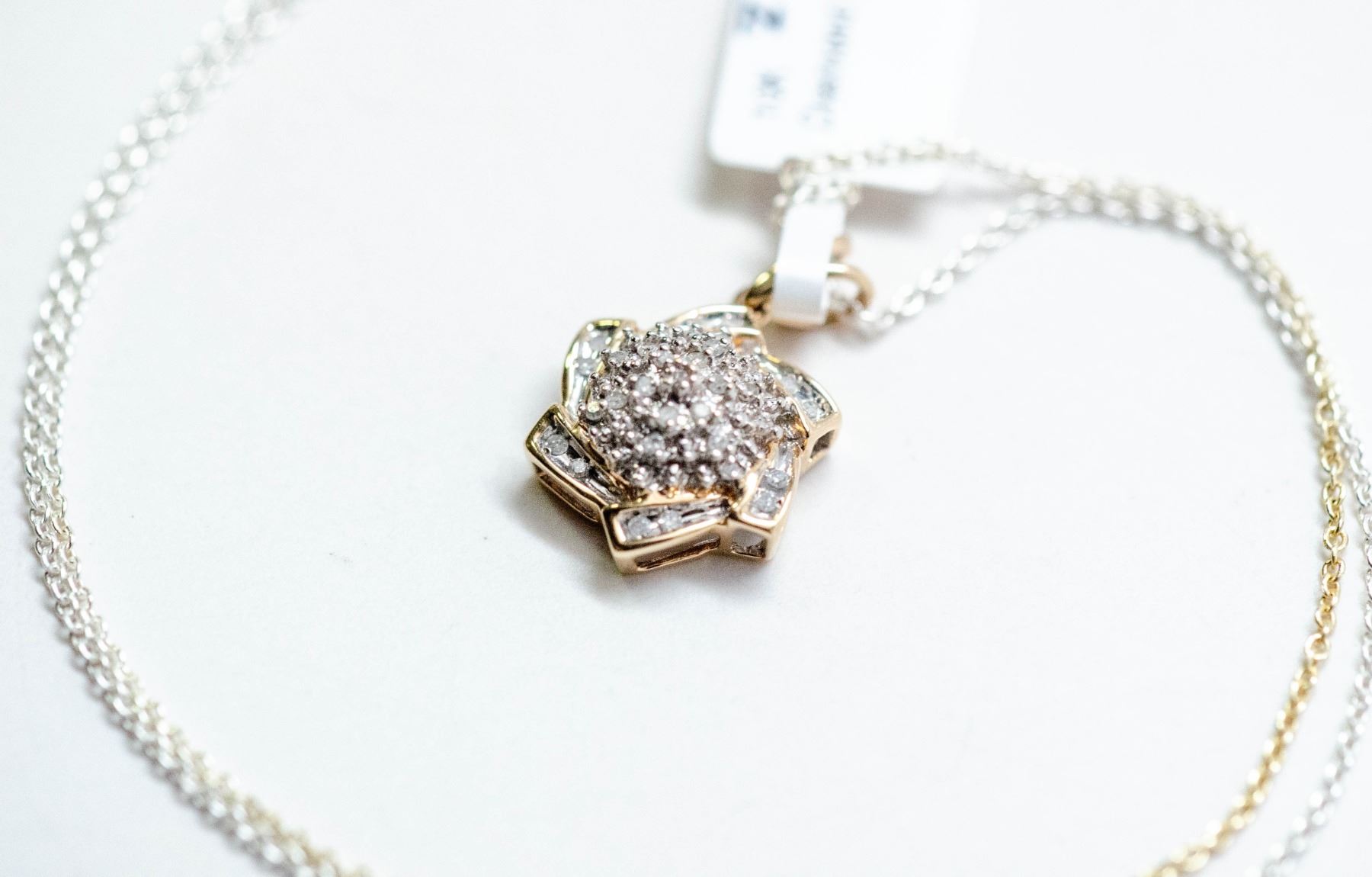 TWO TONE RIBBON DESIGN CLUSTER PENDANT HAS 30 SINGLE CUT DIAMONDS (MEASURING, 1.10MM, CLARITY GRADE I-3, COLOUR GRADE H-I, WEIGHT IN TOTAL 0.30 CARAT). COMES WITH CERTIFICATE OF APPRAISAL FROM LOCAL APPRAISER, SUGGESTED INSURANCE COVERAGE$800.00. JEWELLERY