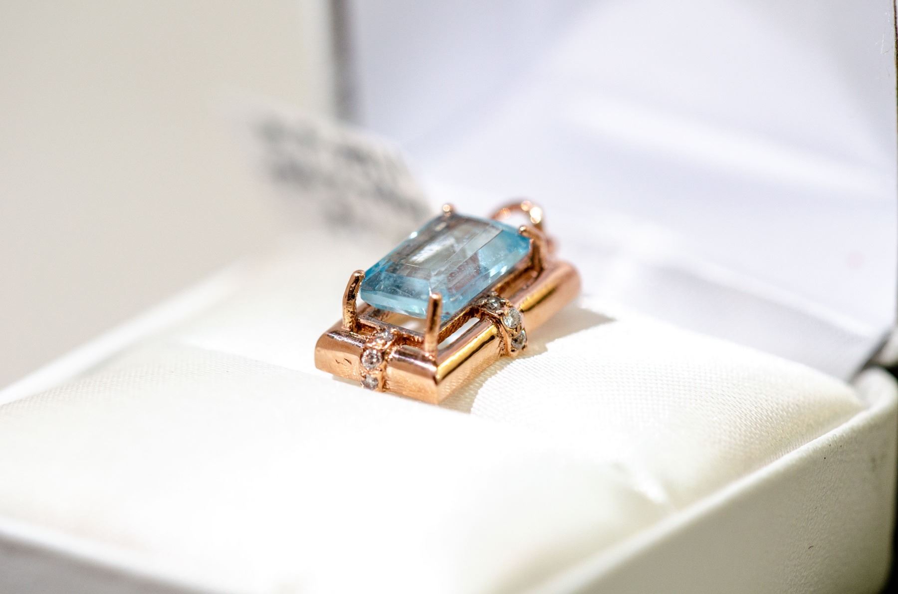 A 14 KARAT ROSE GOLD AQUAMARINE AND DIAMOND PENDANT. THE BRIGHT POLISHED ART DECO STYLE PENDANT IS FOUR PRONG SET WITH, ONE EMERALD CUT NATURAL AQUAMARINE MEASURING.10.53-7.50 X 4.53 MM. TONE MEDIUM, HUE VERY SLIGHTLY GREENISH BLUE. CLARITY GRADE 1-1. THE AQUAMARINE WEIGHS 2.90 CARATS. ACCENTING ARE, 11 ROUND BRILLIANT CUT DIAMONDS MEASURING.140 MM. CLARITY GRADE I-1. COLOUR GRADE H-H, WEIGHING IN TOTAL 0.15 CARAT. TOTAL WEIGHT 3.00 GRAMS. CERTIFICATE OF APPRAISAL FROM LOCAL APPRAISER, SUGGESTED INSURANCE COVERAGE $1800.00.
