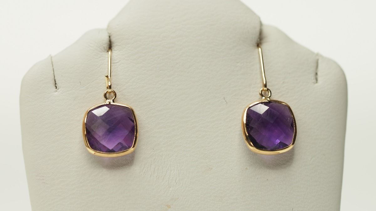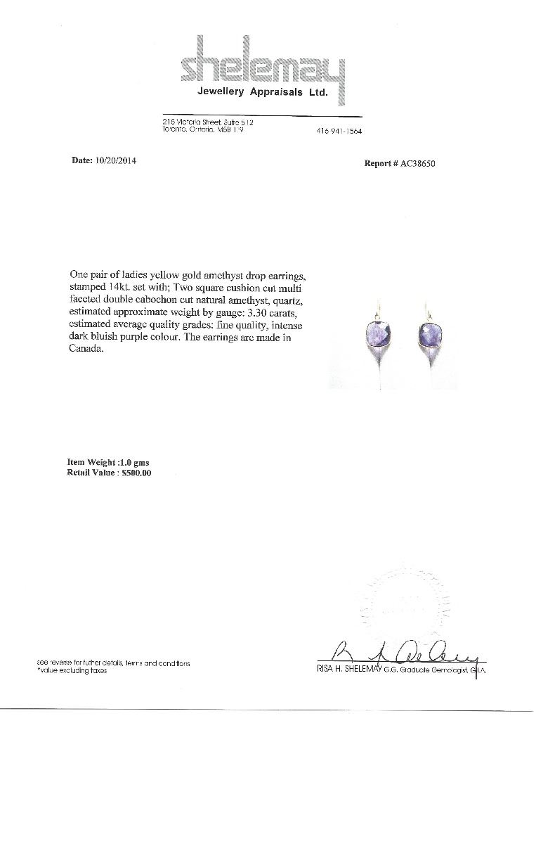 14K YELLOW GOLD AMETHYST EARRINGS. W/ COA- SUGGESTED RETAIL VALUE $500.00