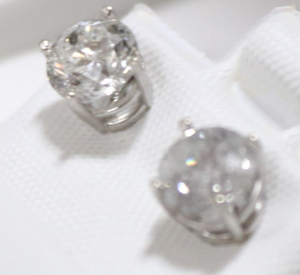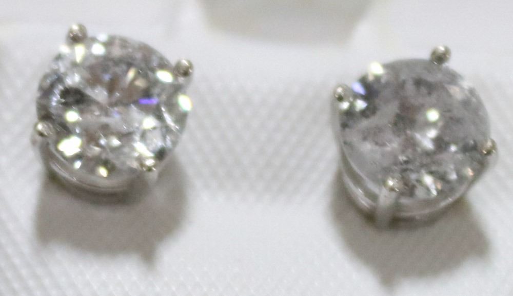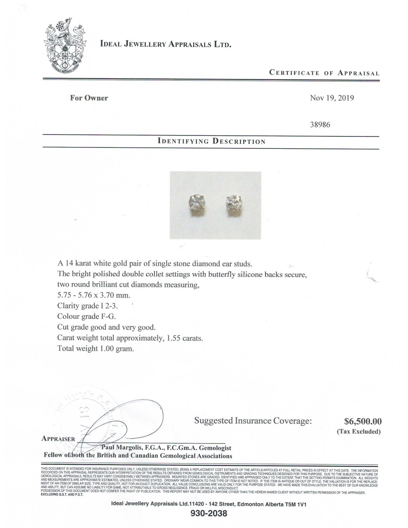 WITH LOCAL APPRAISAL, TWO ROUND BRILLIANT CUT DIAMONDS, CLARITY GRADE I 2-3, COLOR GRADE F-G, CUT GRADE GOOD AND VERY GOOD, CARAT WEIGHT TOTAL 1.55 CARATS, TOTAL WEIGHT 1.00 GRAMS. SUGGESTED INSURANCE COVERAGE $6,500.00. JEWELLERY