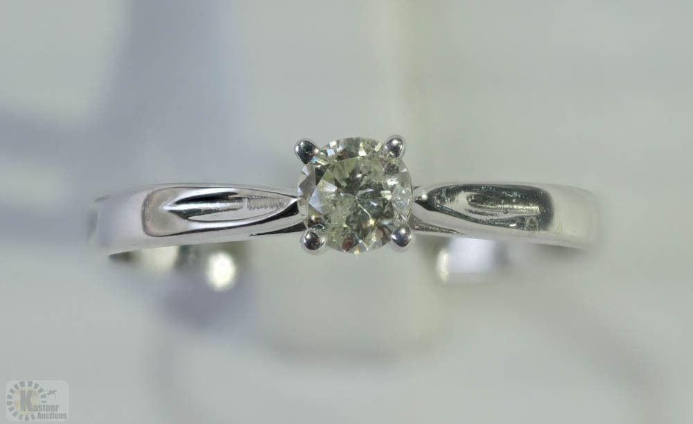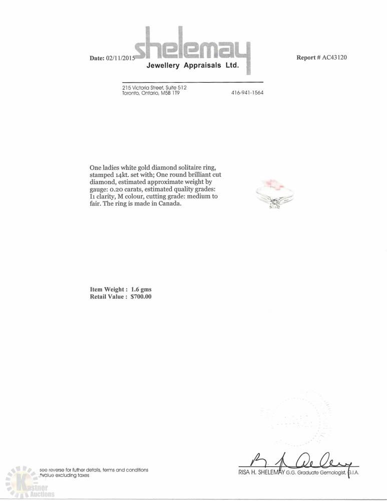 14KT WHITE GOLD DIAMOND(0.20CT)SOLITAIRE RING MADE IN CANADA W/ COA - SIZE 6-SUGGESTED RETAIL VALUE $700.00