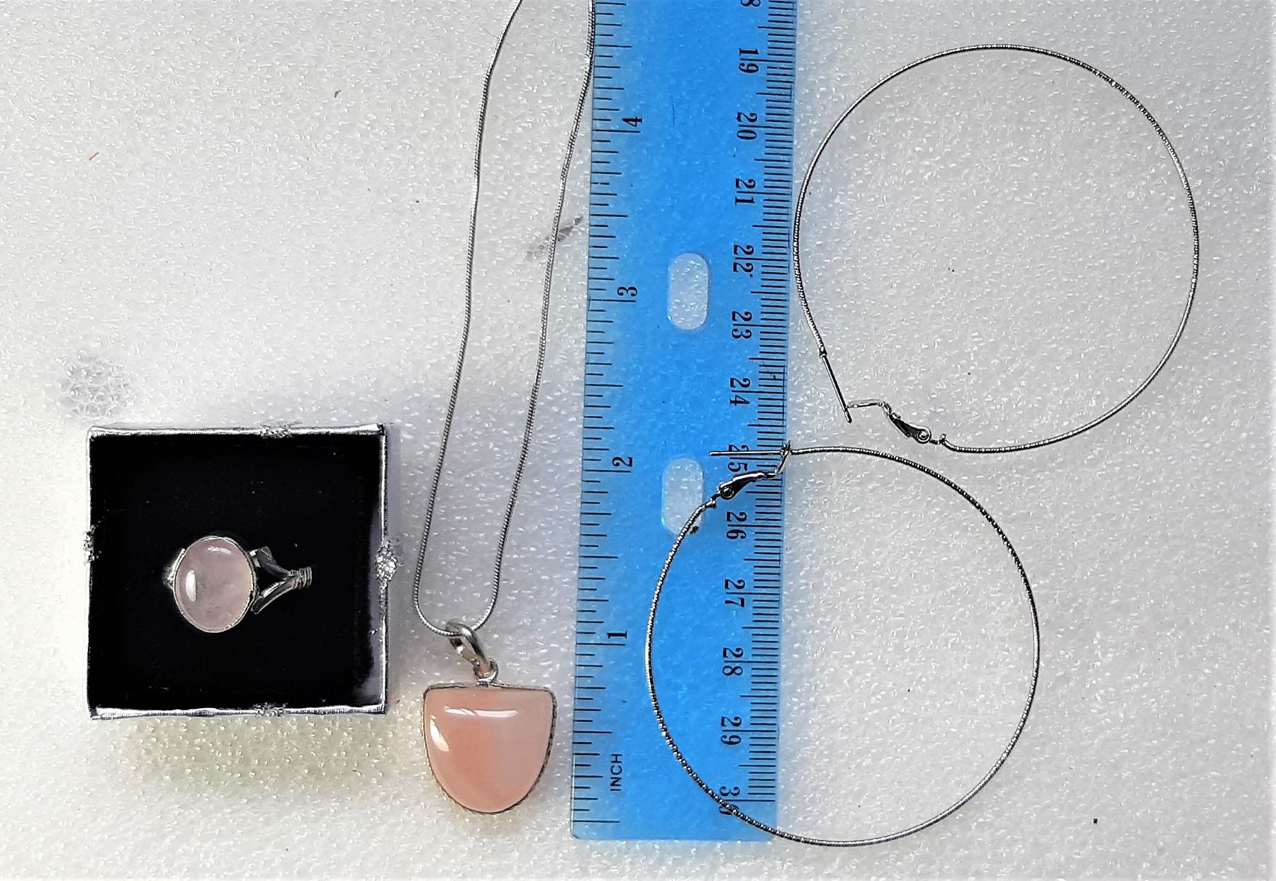 ALL SET IN SILVER TONE, PENDANT IS ON A 20" 925 STAMPED SNAKE CHAIN, RING IS SIZE 9, WITH 2" SILVER TONE HOOP EARRINGS. JEWELRY