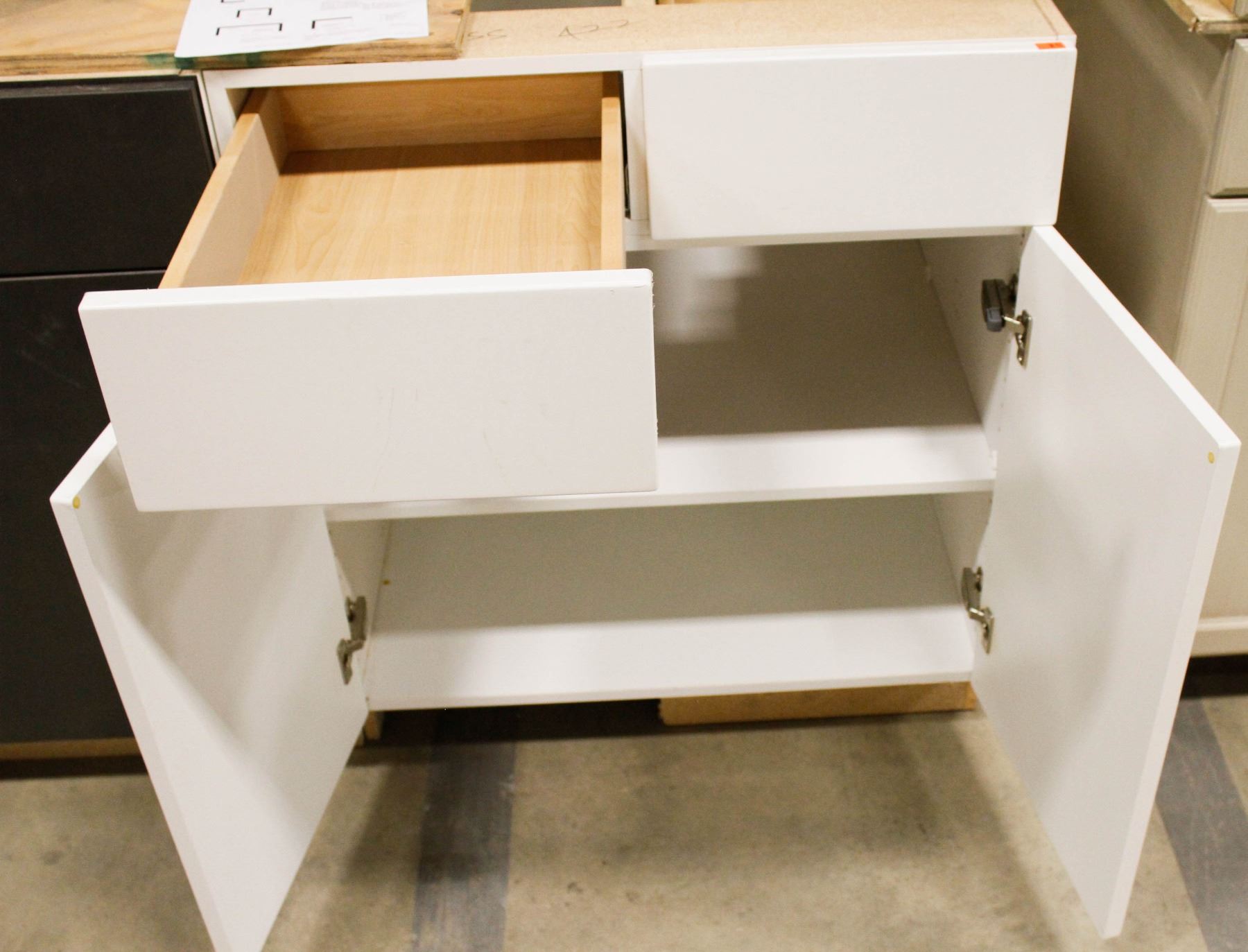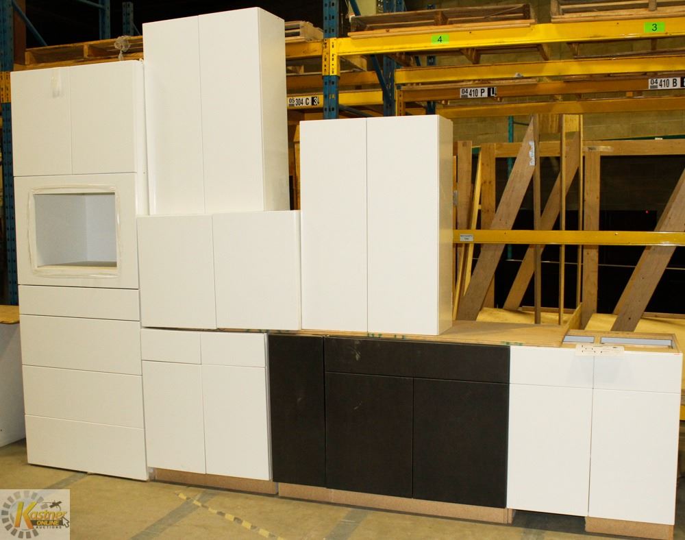 ISLAND, 8 KITCHEN CABS WITH MOLDINGS AND PANELS, ECT. 2 TONE.