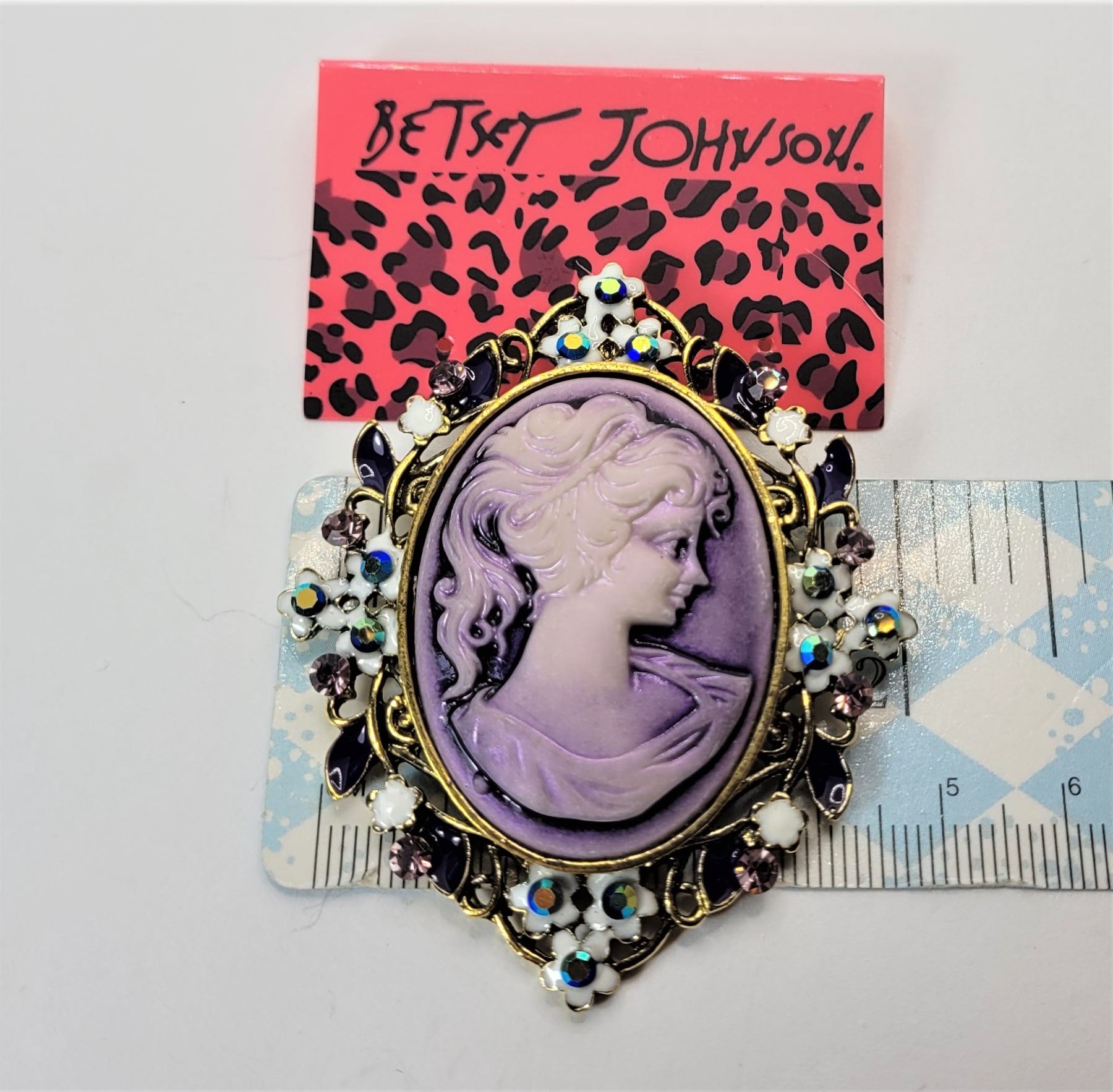 8) BY DESIGNER BETSEY JOHN MAUVE CAMEO GOLD TONE BROOCH WITH WHITE ENAMEL AND CRYSTAL ACCENTS.
