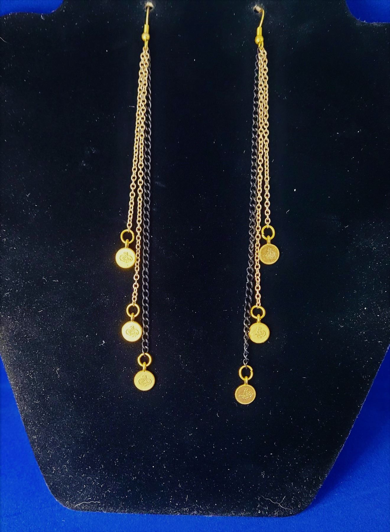DUSTER DROP EARRINGS WITH COIN ACCENTS, ON NICKLE FREE FISH HOOK WIRES, MEASURES 5" IN LENGTH. JEWELLERY
