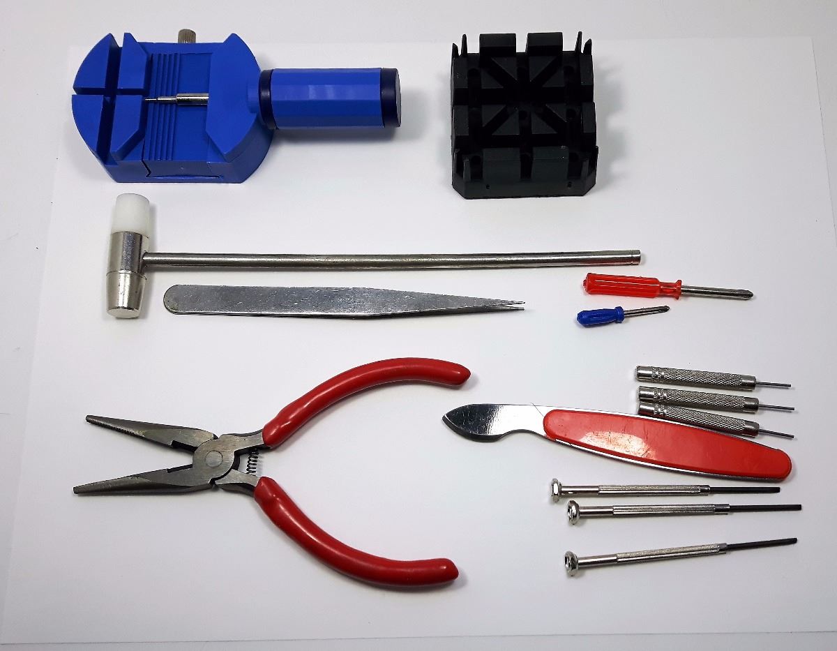INCLUDES PIN REMOVERS FOR BANDS NEEDLE NOSE PLIERS & GENTLE HAMMER FOR TAPPING BACK IN PLACE, MICRO SCREW DRIVERS
