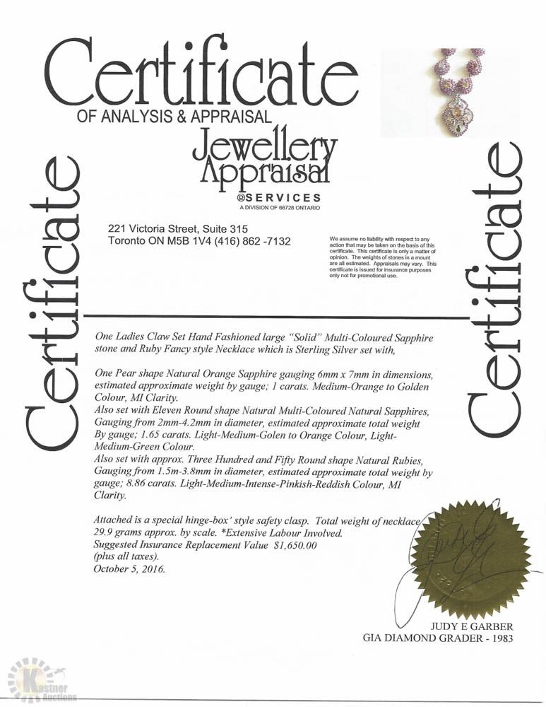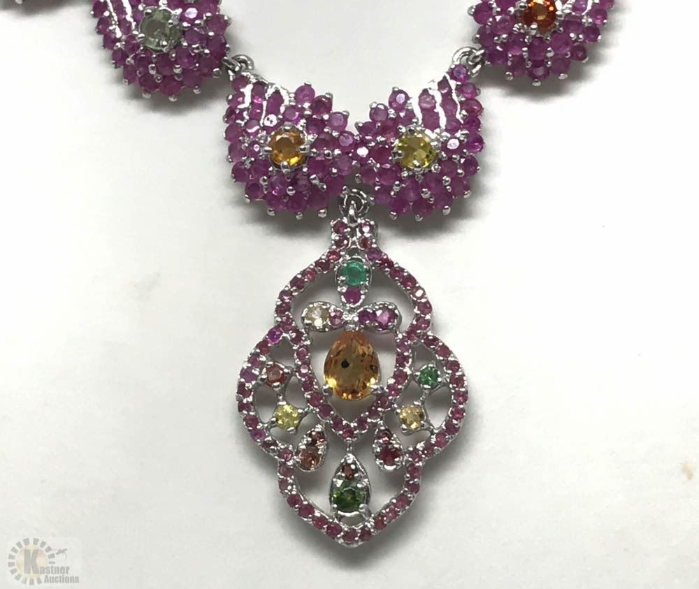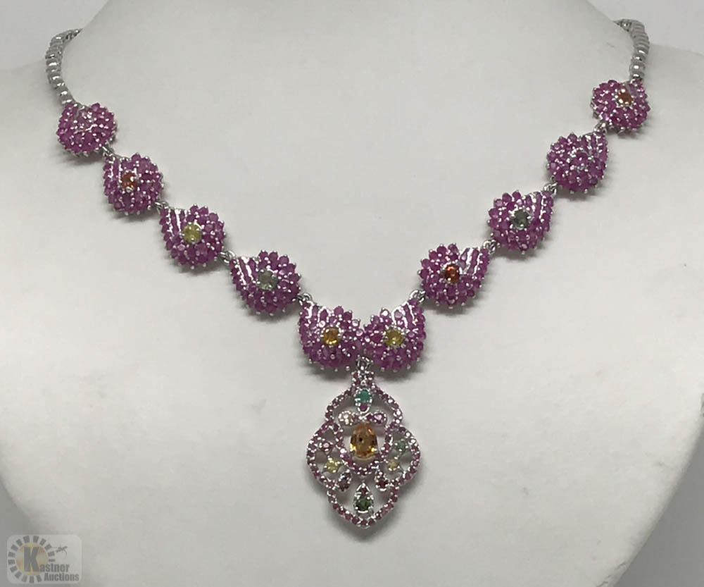 STERLING SILVER FANCY COLOUR SAPPHIRE(2.65CT) & RUBY(8.86CT) NECKLACE. W/ COA - SUGGESTED REPLACEMENT VALUE $1,650.00