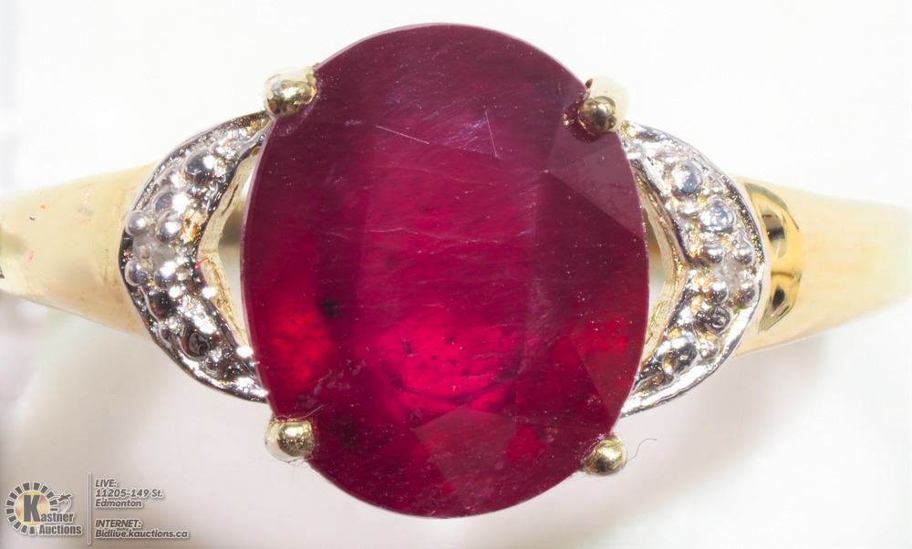 8-NT86- STERLING SILVER RUBY (APP. 3CT) WITH 2 DIAMOND RING SIZE 6.75. JEWELRY