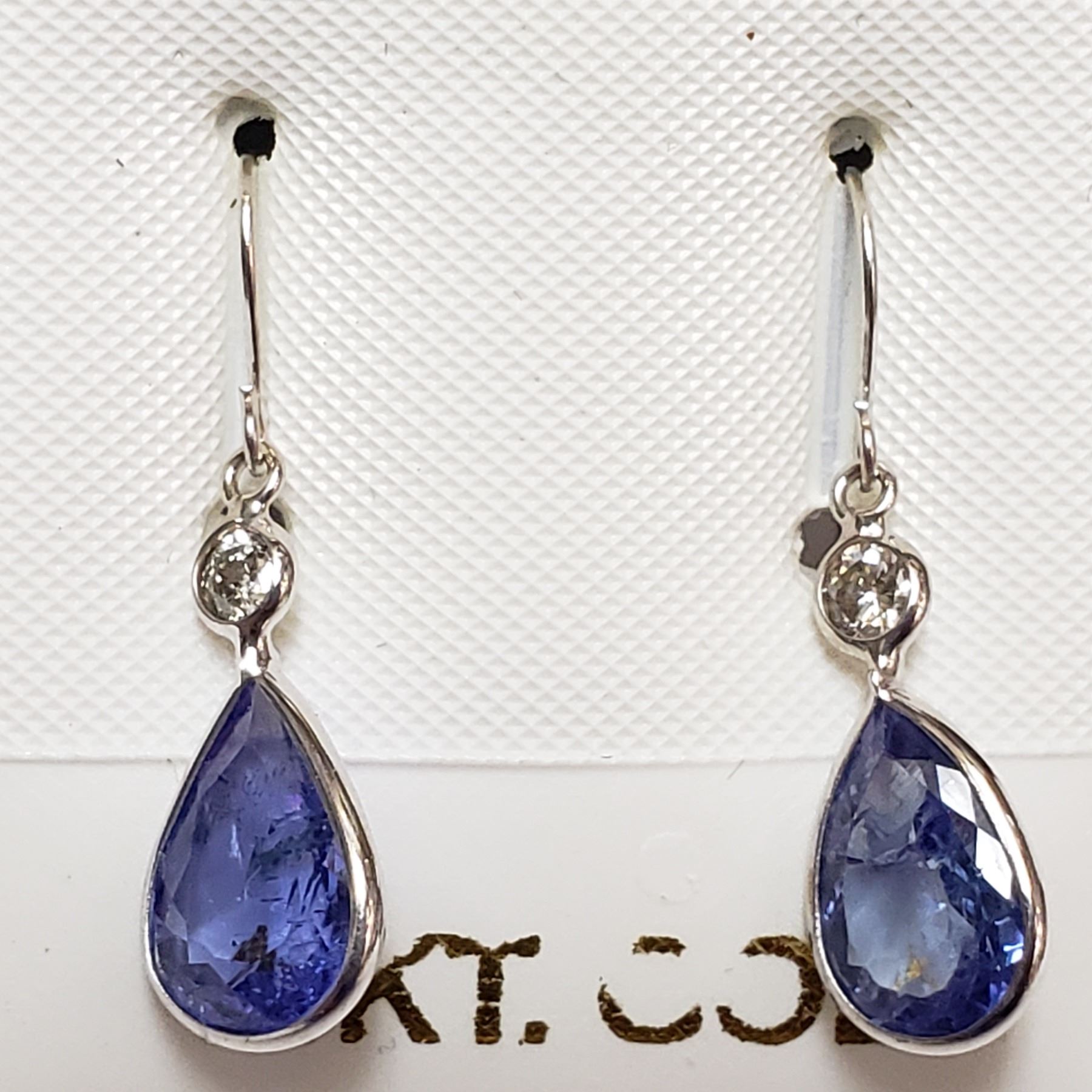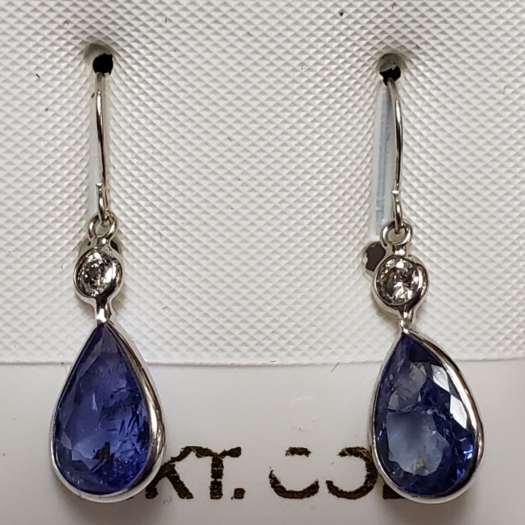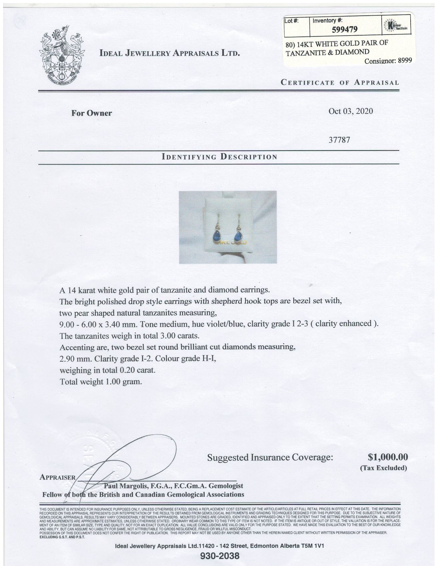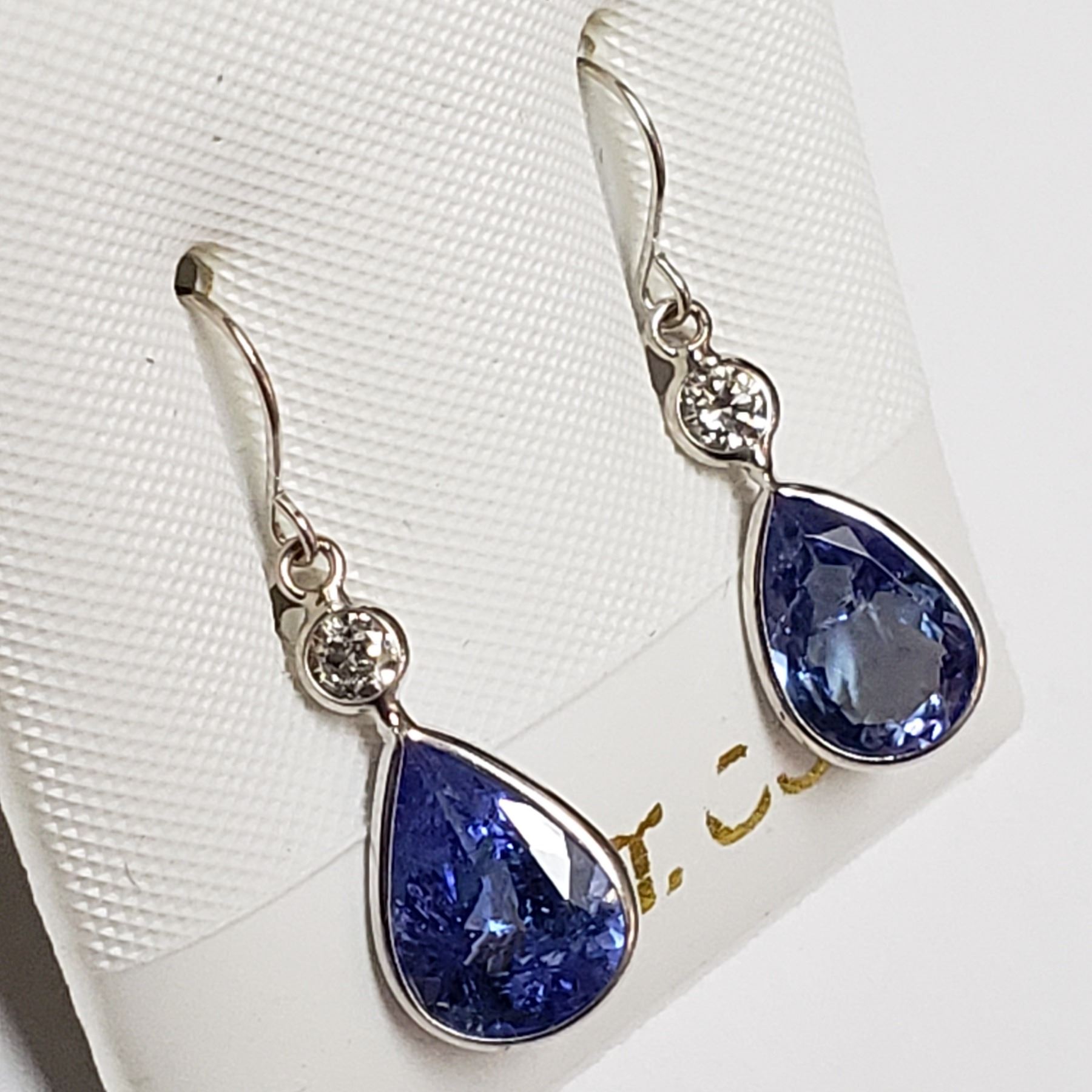 EARRINGS. THE BRIGHT POLISHED DROP STYLE EARRINGS WITH SHEPHERD HOOK TOPS ARE BEZEL SET WITH TWO PEAR SHAPED NATURAL TANZANITES (MEASURING 9.00 - 6.00 X 3.40 MM, TONE MEDIUM, HUE VIOLET/BLUE, CLARITY GRADE I 2-3 ( CLARITY ENHANCED, THETANZANITES WEIGH IN TOTAL 3.00 CARATS) ACCENTING ARE TWO BEZEL SET ROUND BRILLIANT CUT DIAMONDS (MEASURING 2.90 MM, CLARITY GRADE I-2, COLOR GRADE H-I, WEIGHING N TOTAL 0.20 CARAT) COMES WITH CERTIFICATE OF APPRAISAL FROM LOCAL APPRAISER,SUGGESTED INSURANCE COVERAGE $1000.00. JEWELLERY