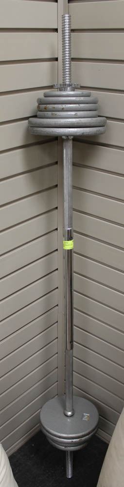 80LBS OF FREE WEIGHTS AND CURLING BAR