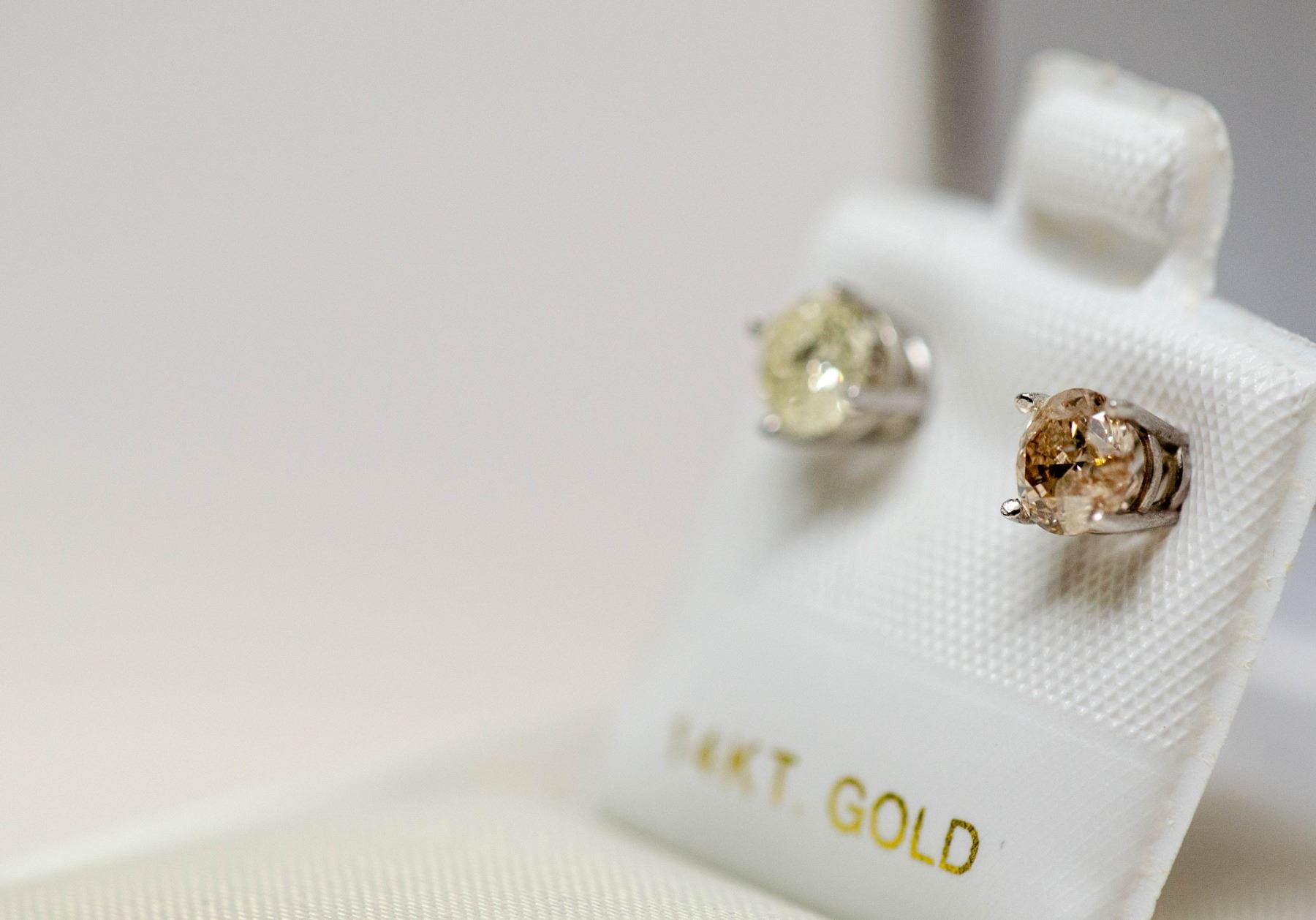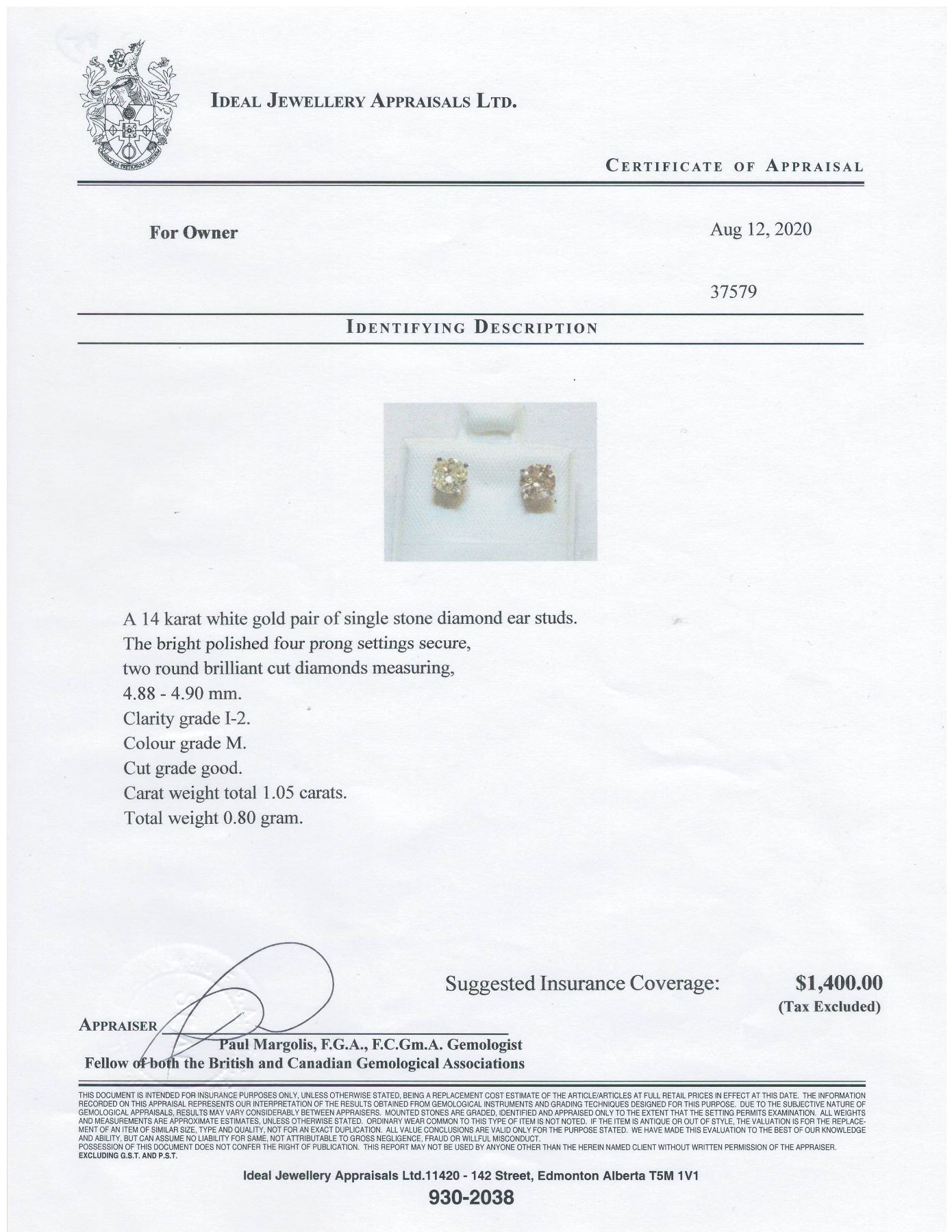 EAR STUDS. THE BRIGHT POLISHED FOUR PRONG SETTINGS SECURE TWO ROUND BRILLIANT CUT DIAMONDS (MEASURING 4.88 - 4.90 MM, CLARITY GRADE I-2, COLOR GRADE M, CUT GRADE GOOD. CARAT WEIGHT TOTAL 1.05 CARATS). COMES WITH CERTIFICATE OF APPRAISALFROM LOCAL APPRAISER, SUGGESTED INSURANCE COVERAGE $1400.00. JEWELLERY