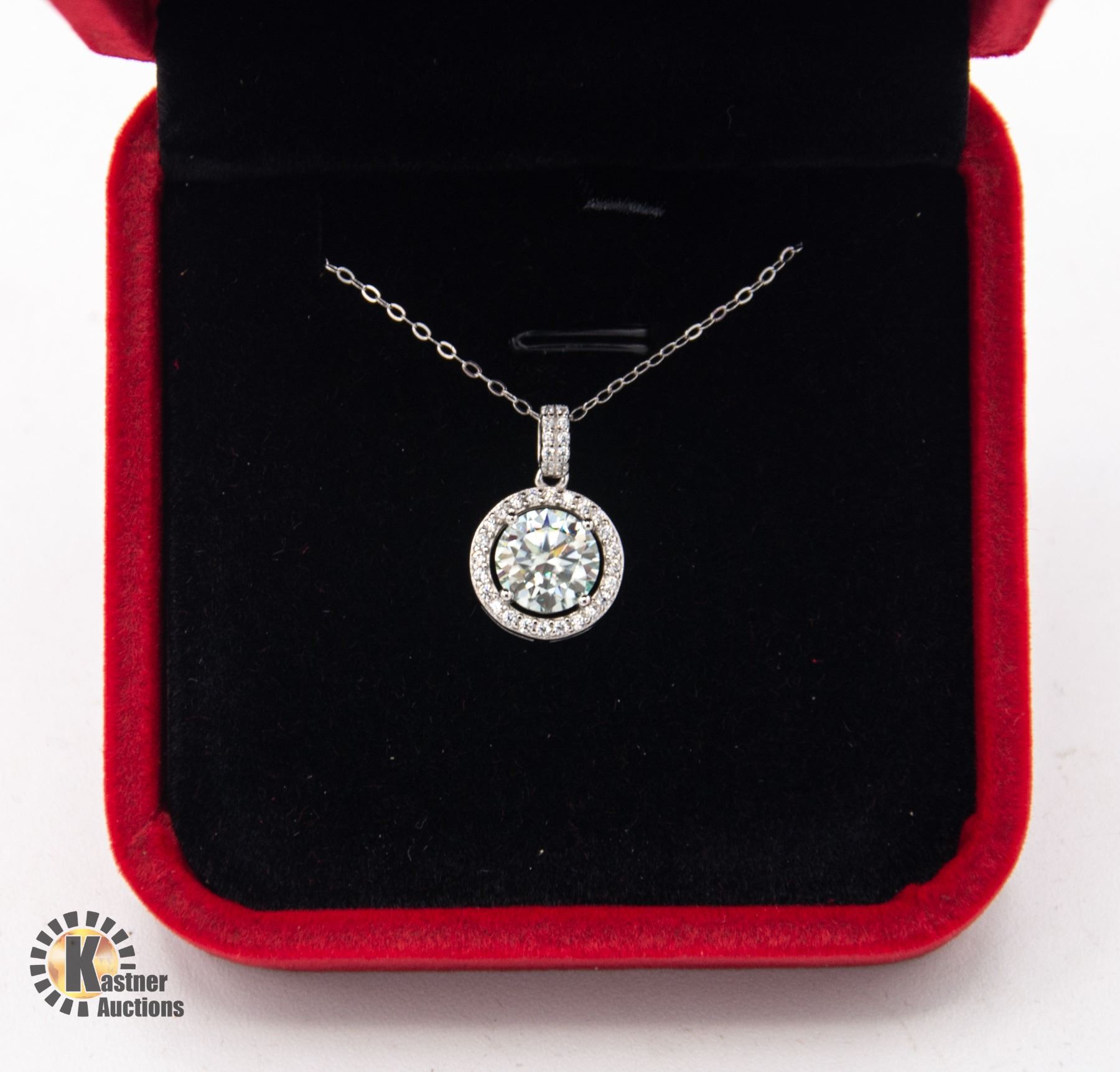VVS D ROUND CUT CENTER WITH A ROUND HALO WITH 24 CUBIC ZIRCONIUM AND 10 MORE IN THE BALE SET IN STERLING SILVER PENDANT AND NECKLACE RETAIL VALUE $1,200.00